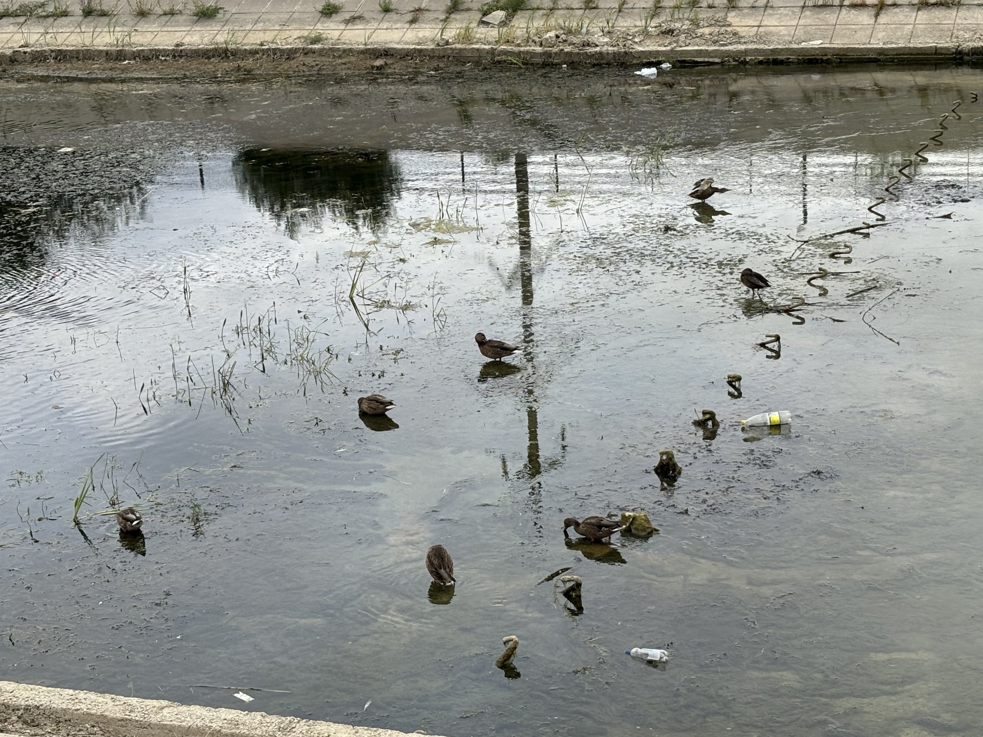 Однако, в отличие от людей, уток, кажется, в этой реке всё устраивает. Водоплавающие весело плещутся в мутной жиже и отдыхают потом на берегу.