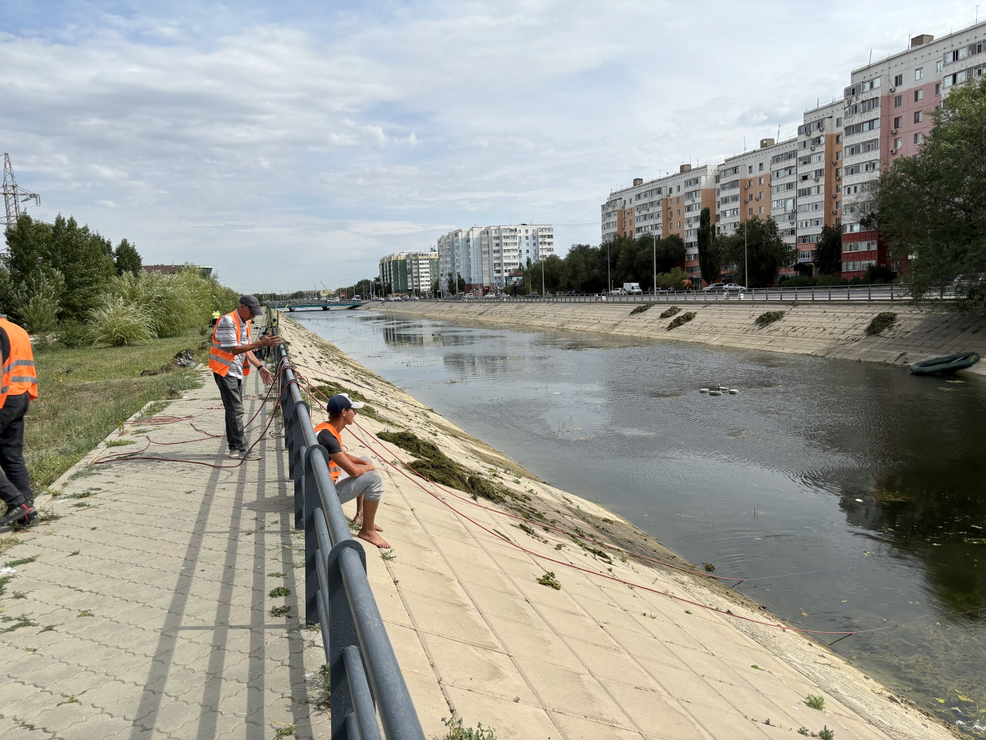 Ситуация ближе к ТРК «Керуен» несколько иная. Вдоль набережной стоят мешки с тиной и травой. Рабочие специальным приспособлением с крюками вытаскивают мусор из воды. По их словам, трудятся они ежедневно: тины очень много, и они просто физически не успевают ее убирать.