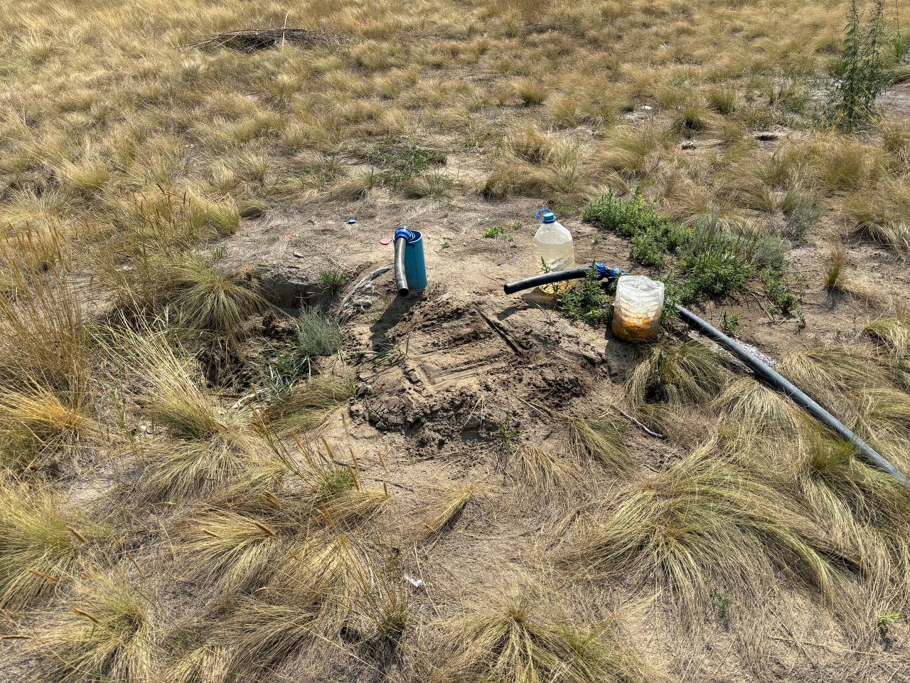 Отдельными рядами высажены другие саженцы, правда, с некоторыми признаками жизни, на них ещё сохранились листья. К этим деревцам система полива не подведена. Неподалёку мы нашли бутыли с водой и отдельную трубу. Полагаем, что отсюда с помощью насоса берут воду и уже вручную поливают то, что ещё не погибло.
