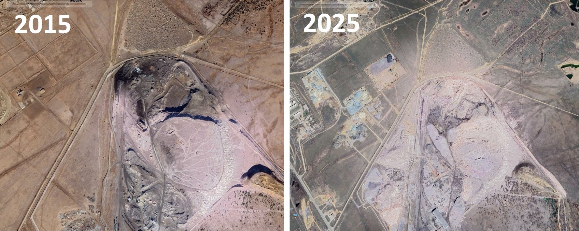Для сравнения: территория шлакоотвалов в 2015 году и 2025-ом.