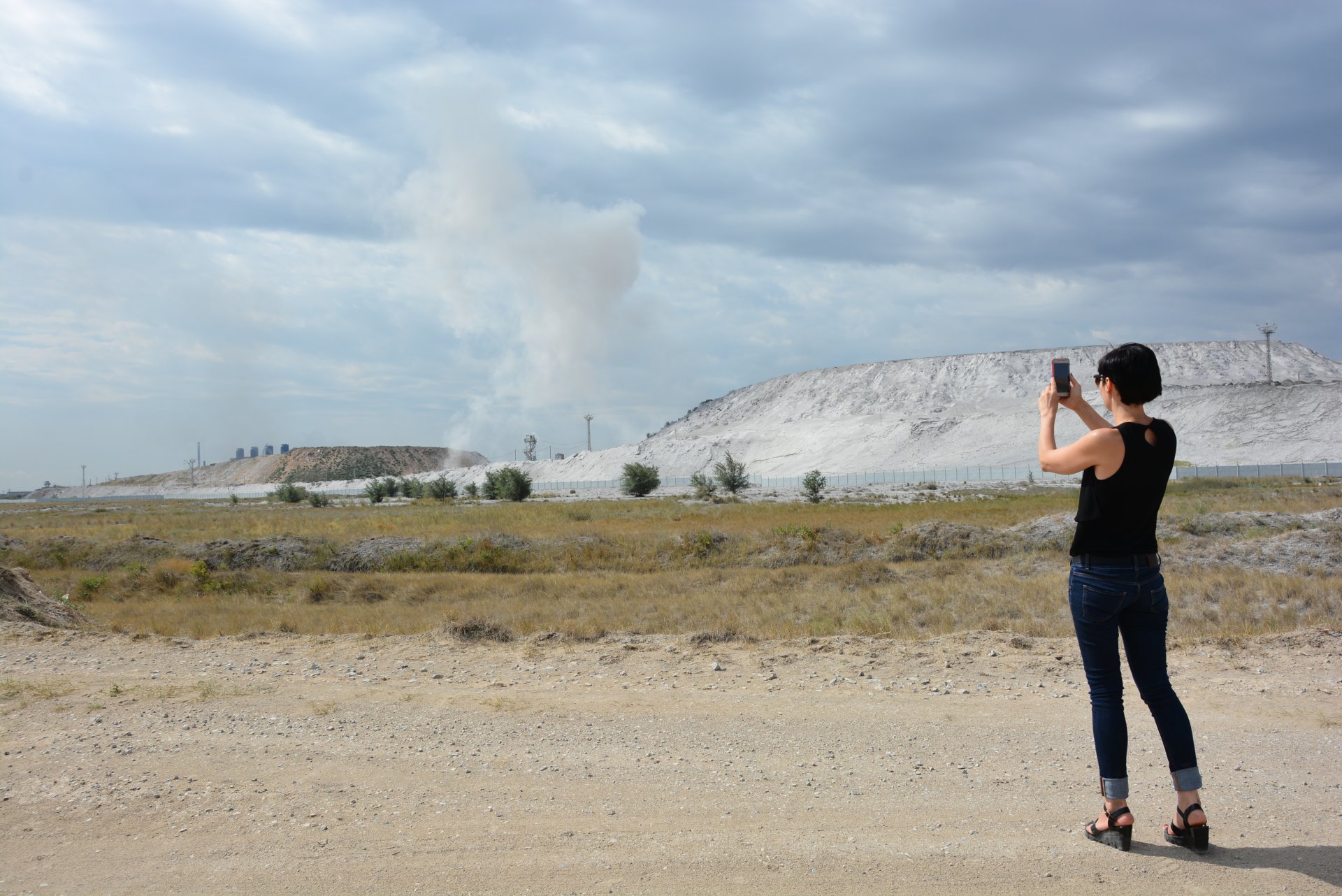 К сожалению, в ходе пресс-тура руководство АЗФ не стало подвозить репортеров и экоактивистов к участку, где шлакоотвалы соседствуют с кладбищем. Не разрешили нам и подняться на сами горы отходов. Нас привезли с восточной стороны, к началу шлакоотвальной гряды.