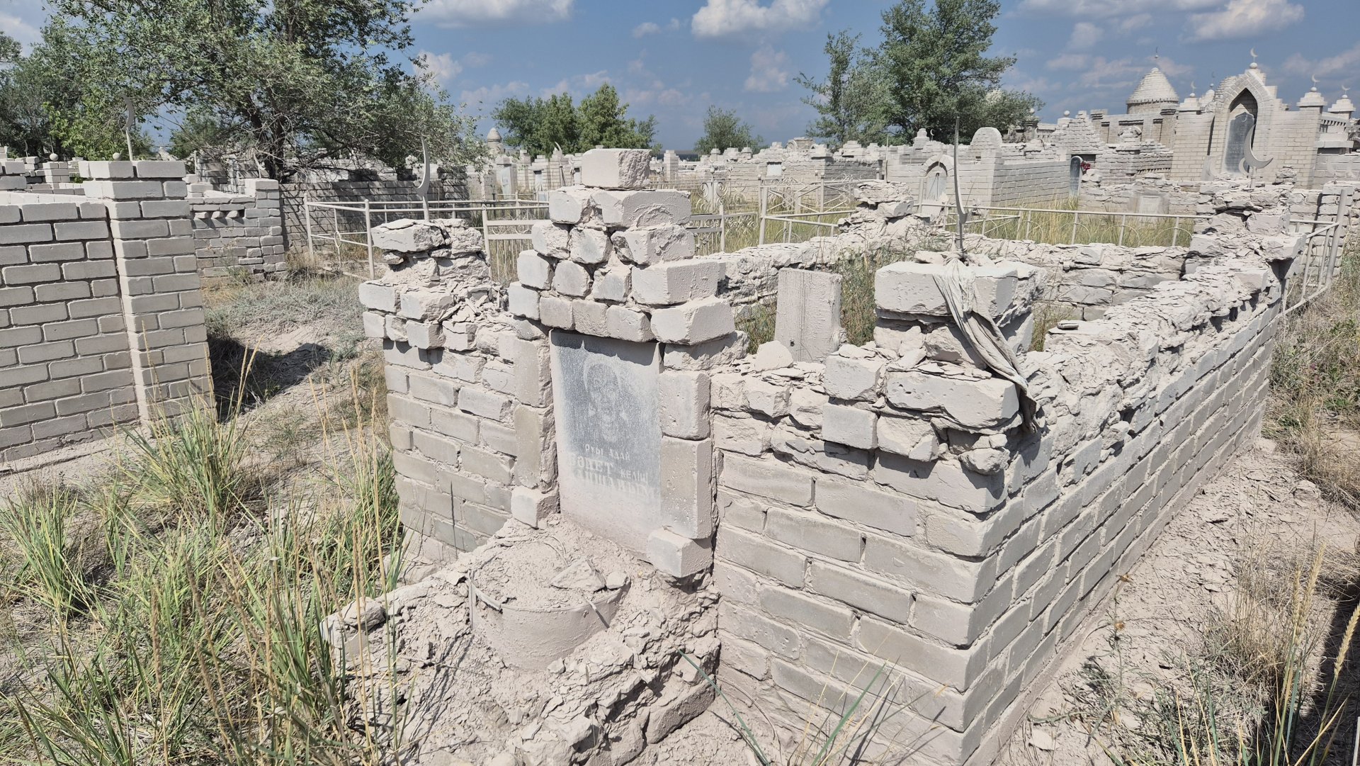 Пыль разъедает мазары и надгробные плиты на кладбище, расположенном возле шлакоотвалов. Август 2025 года.