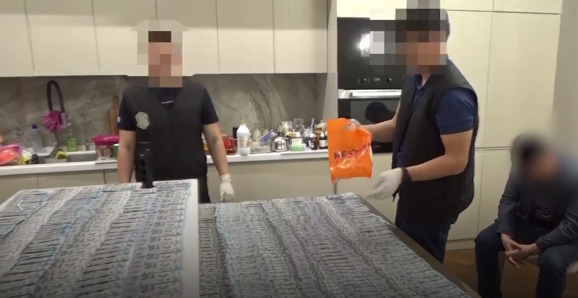 Далее на записи видно, что женщина подходит к некоему мужчине, стоящему перед гостиницей. Его лица не разглядеть. Момент передачи денег на видео не представлен. После их сменяет запись, на которой запечатлен холодильник. Из лотка морозилки сотрудники Антикора вынимают оранжевый пакет «Марвин», в котором находятся деньги. Позднее в ролике показано, как из этого пакета достают шесть пачек купюр по 20 тысяч тенге. Деньги занимают два стола. На записи также запечатлён мужчина, сидящий рядом с деньгами и опустивший голову. Лицо его скрыто.