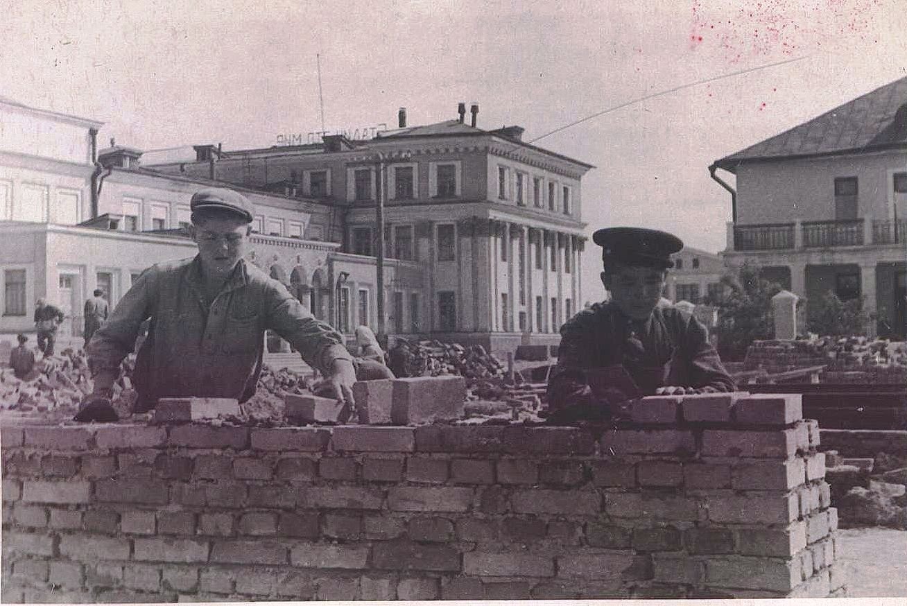 1 августа 1953 г. Воспитанники школы ФЗО Завякин и Бисенов. На фоне ДК Металлургов.