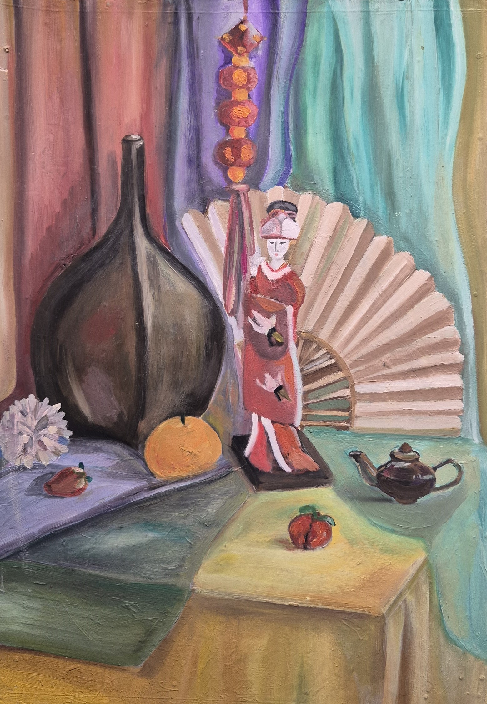 Из картин, созданных еще в лицейские годы, Айнур выставила только натюрморт в японском стиле. Работа хоть и учебная, но в ней уже проглядывает индивидуальная манера автора.