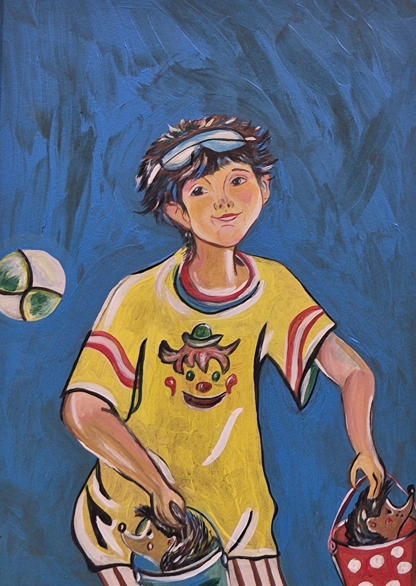 - Картинка с братиком называется «Велосипедист». А в ведерках у него два ежика. В детстве у нас ежик жил, поэтому я решила добавить их в композицию.