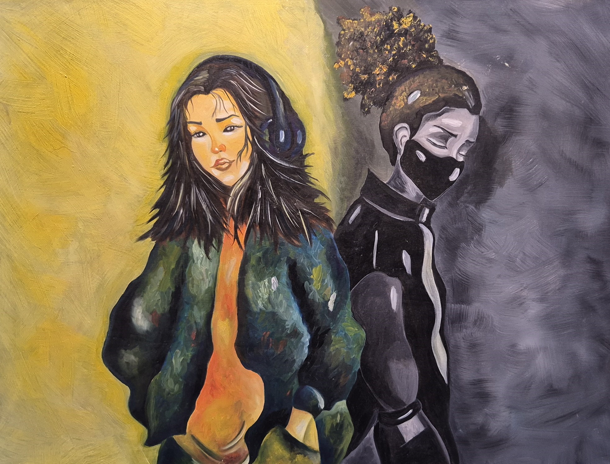 На картине «Ковид» Айнур изобразила девушку в двух состояниях – до эпидемии и во время карантина. Половина холста ахроматична, глаза персонажа зажмурены, выражение лица наполнено скорбью.