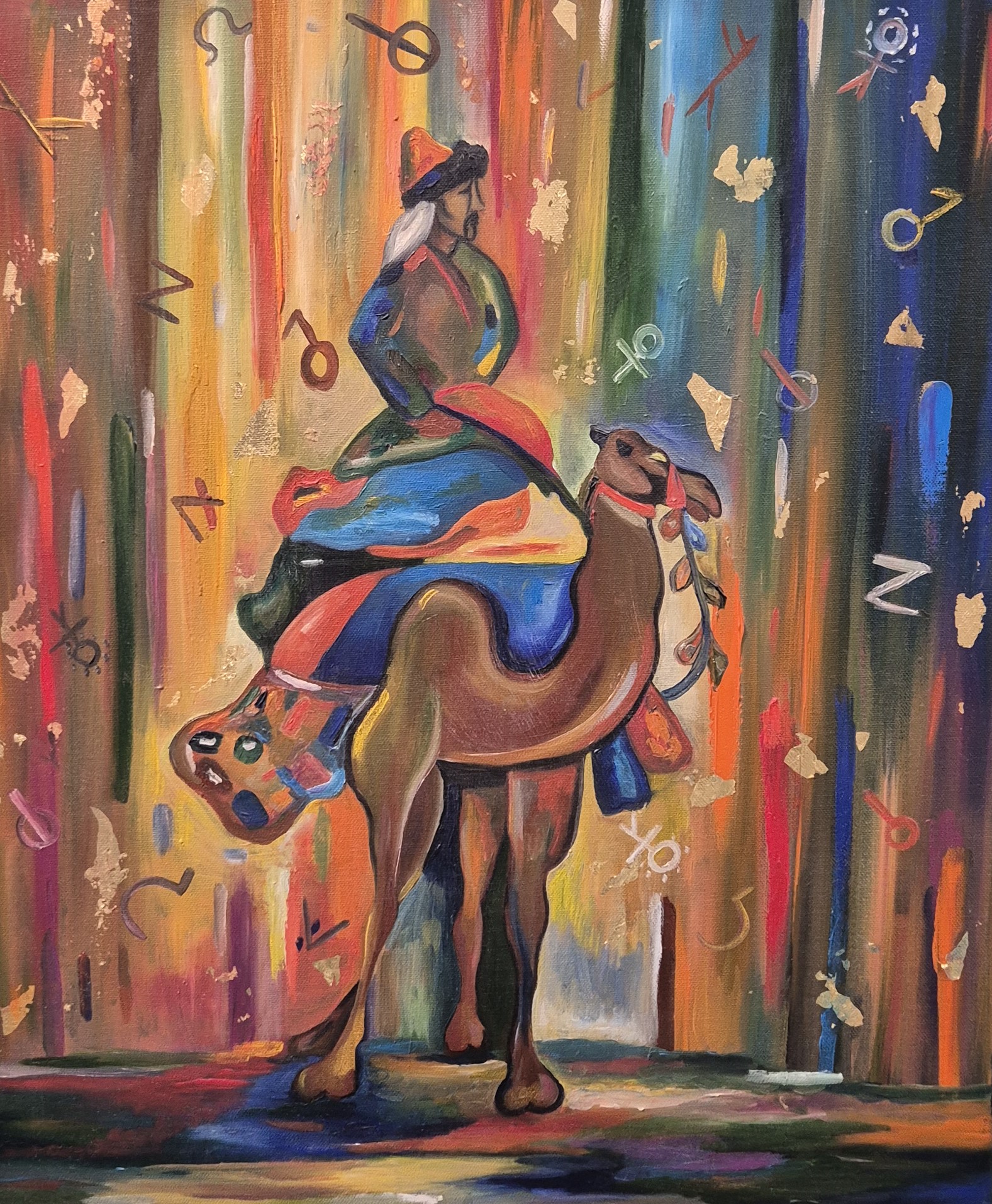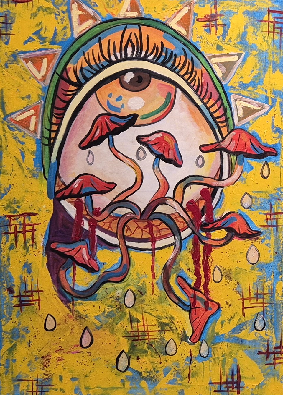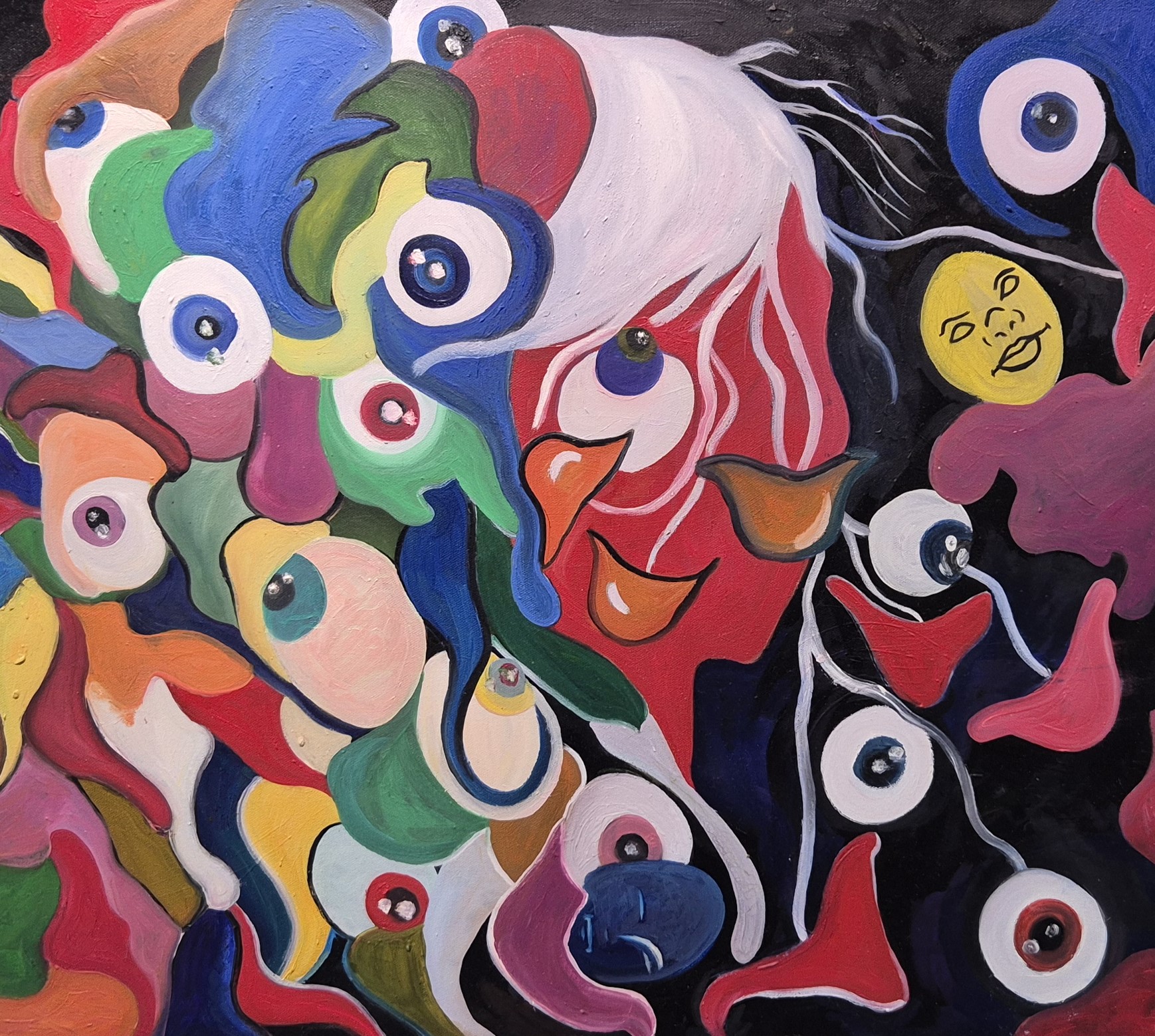 - «Девочка», «Верблюд», «Подсолнух», «Маленький портрет бабушки» - эти картины я выполнила в одном стиле. И он, как мне кажется, ближе к абстракции. Вот картина «Глаза». На ней - девушка. Лица ее почти не видно. Что-то с ней произошло. Изнутри вырастают новые глаза, прорастают грибы. Слетают маски… Но я уверена: девушка справится и победит в этой борьбе.
