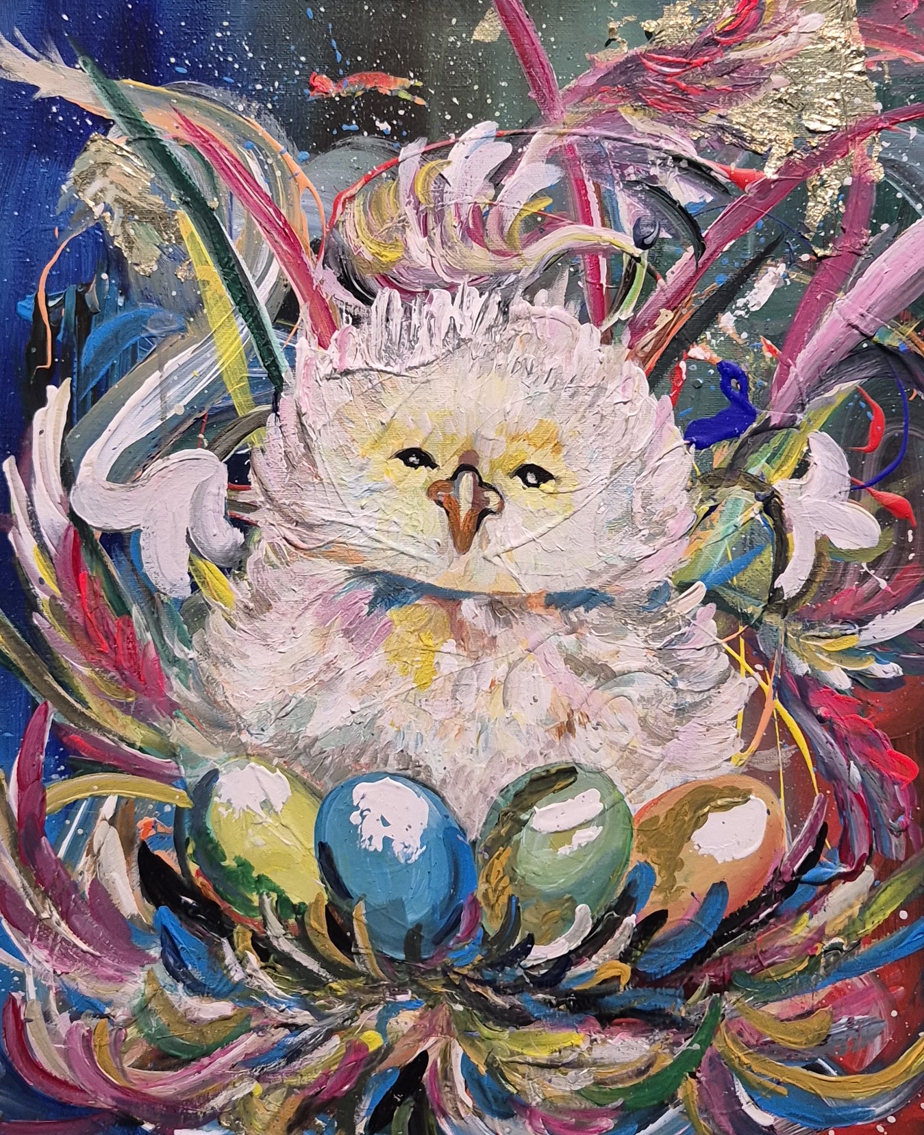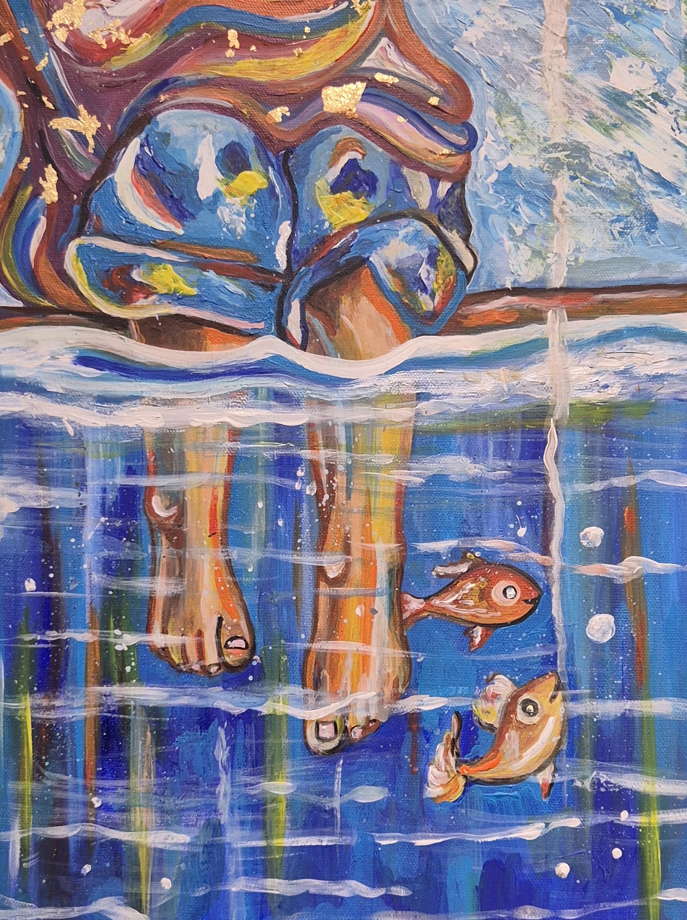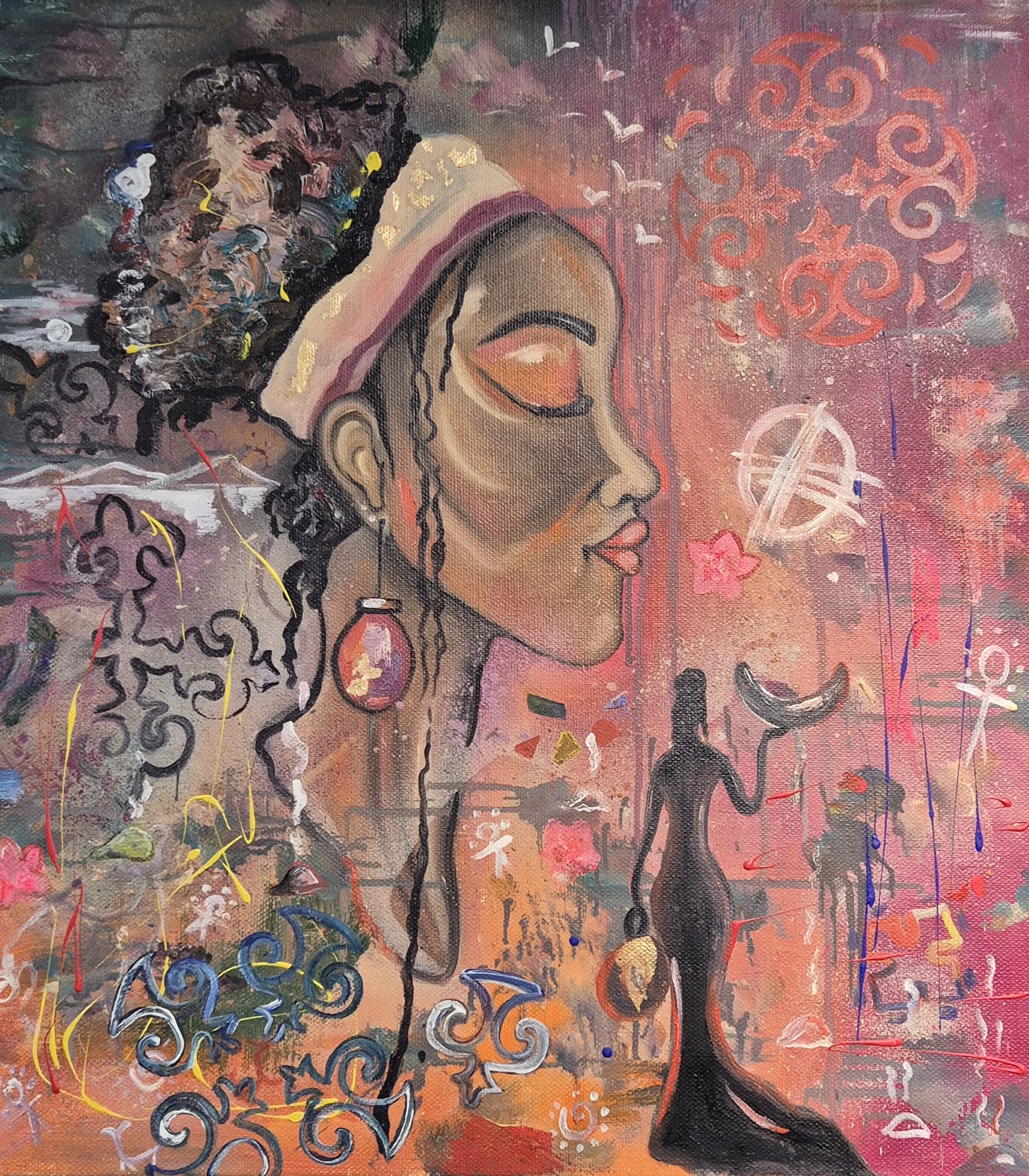 - «Девочка», «Верблюд», «Подсолнух», «Маленький портрет бабушки» - эти картины я выполнила в одном стиле. И он, как мне кажется, ближе к абстракции. Вот картина «Глаза». На ней - девушка. Лица ее почти не видно. Что-то с ней произошло. Изнутри вырастают новые глаза, прорастают грибы. Слетают маски… Но я уверена: девушка справится и победит в этой борьбе.