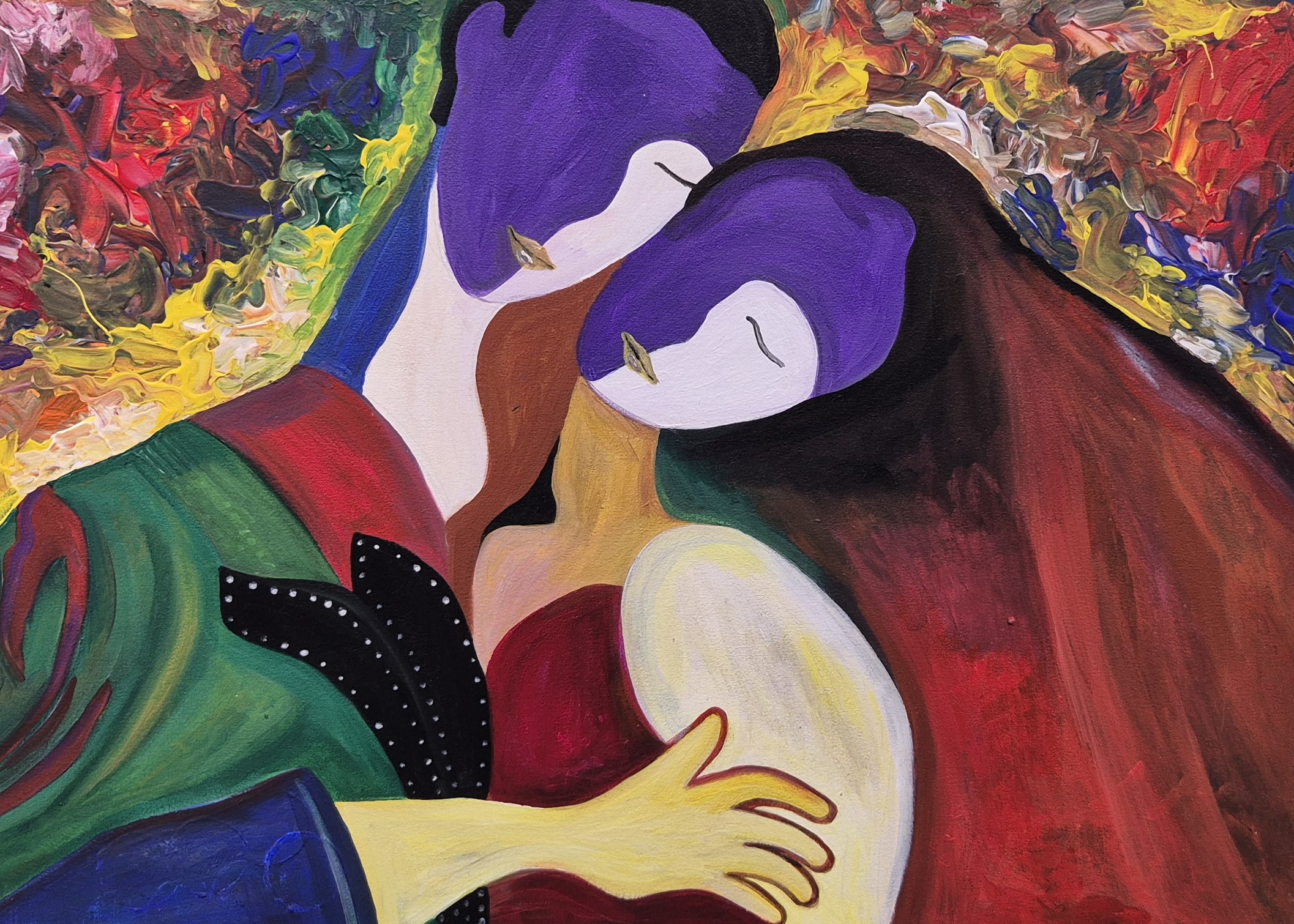 Прикрывает свои глаза и девушка с парнем, обнимающиеся на картине, названной просто - «Махаббат». Но здесь они закрыты от обретенного счастья.