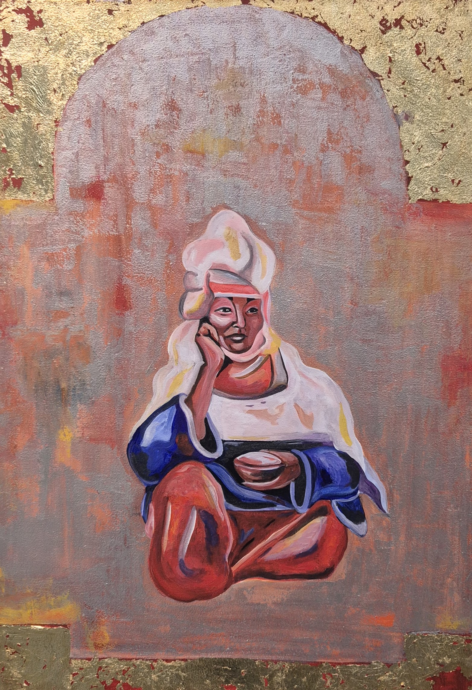 - Эта картина называется «Аяулы әже», - показывает художница. - Естественно, я нарисовала свою бабушку. Она, как правило, не одевается в национальные одежды. Но я представила ее именно в таком образе. Лицо, думаю, получилось очень похожим. Бабушка не знала, что я ее рисую, но портретом осталась очень довольна.