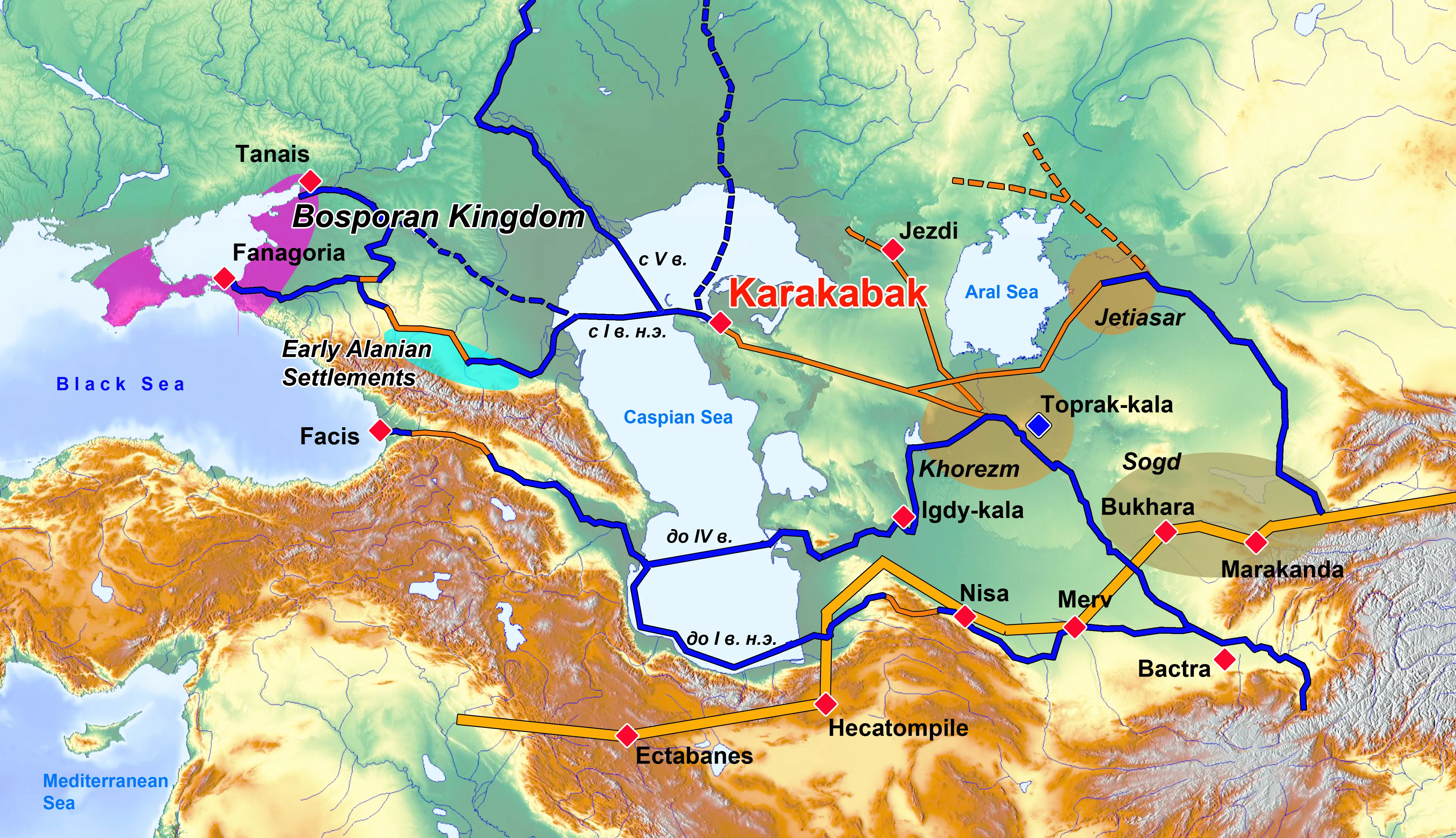 Археологи считают, что образовавшийся «новый торговый маршрут начинался в районе Каракабака-Аспаботы, вел через Северный Каспий к устью реки Терек и далее в Северное Предкавказье». «Оттуда, по кубанскому речному коридору, он продолжался через Северное Предкавказье к побережью Азовского моря (Меотиды)».