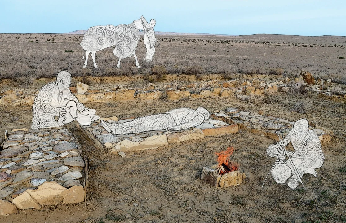 Алтынказган. Реконструкция обряда выкладывания тел на дахме.