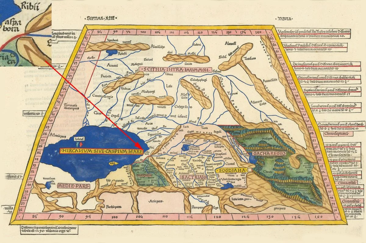 Карта Азии Клавдия Птолемея с нанесенной Аспаботой на побережье Каспийского моря.