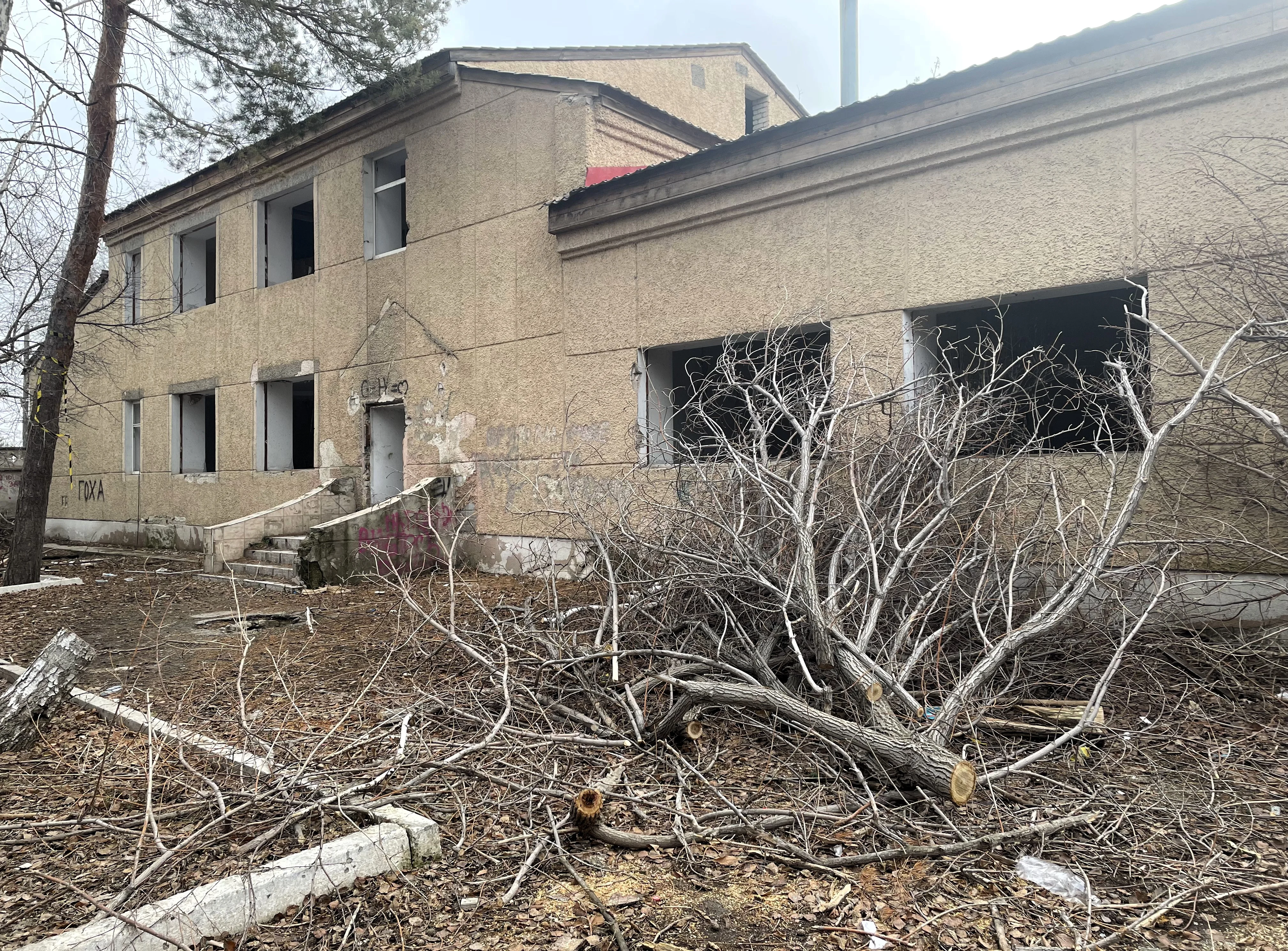Здесь же входные ворота и металлические элементы, судя по всему, давно спилены и сданы в пункты приёма. Светильники и столбы сломаны, будка охраны лежит в завалах. Бордюры заросли и рассыпались. При этом вся площадь засажена большими деревьями, а рядом со зданием растут великолепные высокие сосны и берёзы. На земле действительно лежат спиленные брёвна и заготовлен сухостой.