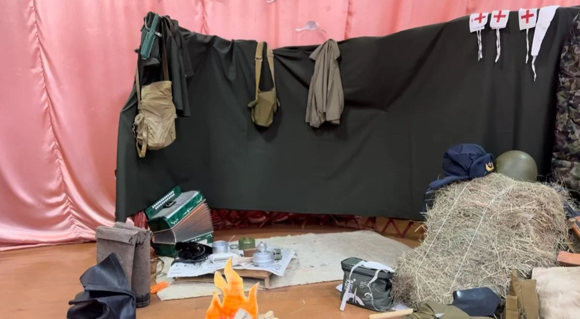 Тут и воссозданный привал между боями. Расположившись у костра, можно написать письмо домой. А привычная гармонь ждет своего часа. Есть и уголок патриотической литературы. Всё это заслуги Веры Адаменко - учителя художественного труда, Амины Абилкаировой - соцпедагога, Марала Даулетьярова - учителя НВП, Ханат Хажай - учителя истории, которые взялись мне помочь. Им удалось найти раритетные предметы военной тематики, подготовить реквизит, оформить фотозону. Последние приготовления, маленькая репетиция. За ноутбуком Нургуль Лукпанова - учитель английского языка; ответственные за съёмку Амина Абилкаирова и ученица Алтынай Шабарова. Полный зал учащихся и педагогов. Долгожданные гости: местные жители - старожилы села, потомки ветеранов войны и тыла. Мы начинаем.