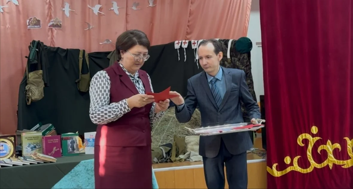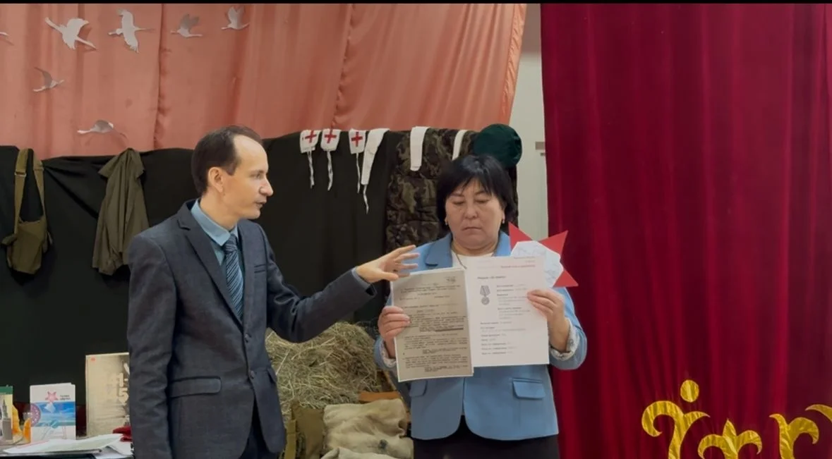 Дальше - больше. Поведал и о том, что в текущем году имена двух талдысайцев: Ивана Хоменко (моего прадеда) и его однополчанина Александра Твердохлеба - были увековечены в Орловской области на Кривцовском мемориале. Рассказал, с чего начинались поиски солдат, которые числились без вести пропавшими, о сотрудничестве с ОФ «Боевое братство». О том, что письмо, отправленное в школу несколько лет назад, стало начальной точкой для меня в деле открытия школьного музея. Показал видео и фото о своей поездке в Орловскую область, в музей Боевой Славы 60-й Стрелковой Севско-Варшавской Краснознамённой ордена Суворова дивизии, действующей при школе №1561 города Москвы, где служили два товарища. Вручил сувениры в знак преемственности, взаимодействия школ, и землю с мест сражений, где пролили свою кровь наши земляки. А еще передал в фонд музея толстую папку. В ней материалы, собранные мною по крупицам в процессе многолетнего поиска (переписка, ответы на запросы, два выпуска газеты «Актобе Таймс» о моей истории: № 34 от 28.08.2025 г. и №35 от 04.09.2025 г.). А после обратился к залу: «Ищите своих родных - солдат той страшной войны, погибших и без вести пропавших на полях сражений. Верьте в себя и не сдавайтесь. И всё обязательно получится!»