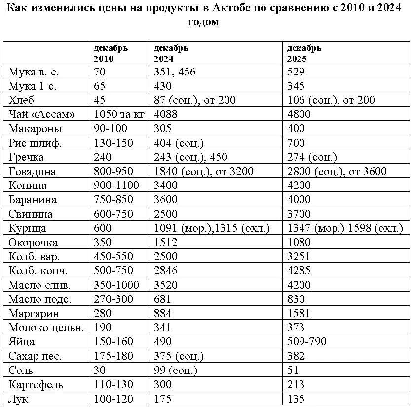 Свести общую инфляцию к 7,5% Нацбанк не надеется и в 2026-ом. Прежний прогнозный уровень на предстоящий год повышен до 9,5-12,5%. Методика, применяемая финрегулятором для исчисления инфляции, неоднократно подвергалась критике со стороны мажилисменов. По мнению депутатов, цена на основные продукты питания в Казахстане повысились как минимум на 25%. Репортеры «АТ» по устоявшейся традиции перед Новым годом провели мониторинг цен в актюбинских супермаркетах. И представили его итоги в сравнении с ценами декабря 2024 и 2010 года. Разница за 15 лет – колоссальная!