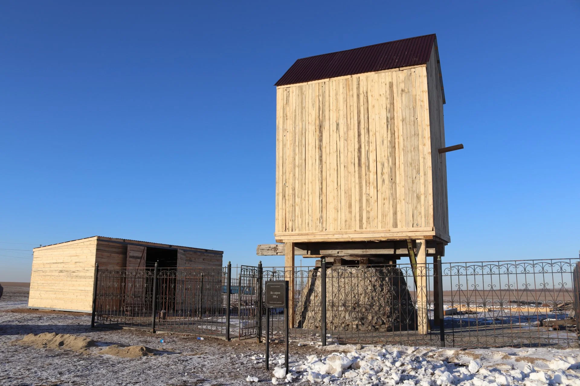 16 декабря 2025 года руководитель Центра исследования, реставрации и охраны историко-культурного наследия Фархад Досмуратов сообщал репортеру «АТ», что реставрацию завершат до Нового года. Судя по всему, обещание свое чиновник сдержал. Но результат реставрации ошеломляет – к «скворечнику» из нескольких досок прирастили крышу и прилепили что-то вроде пропеллера.