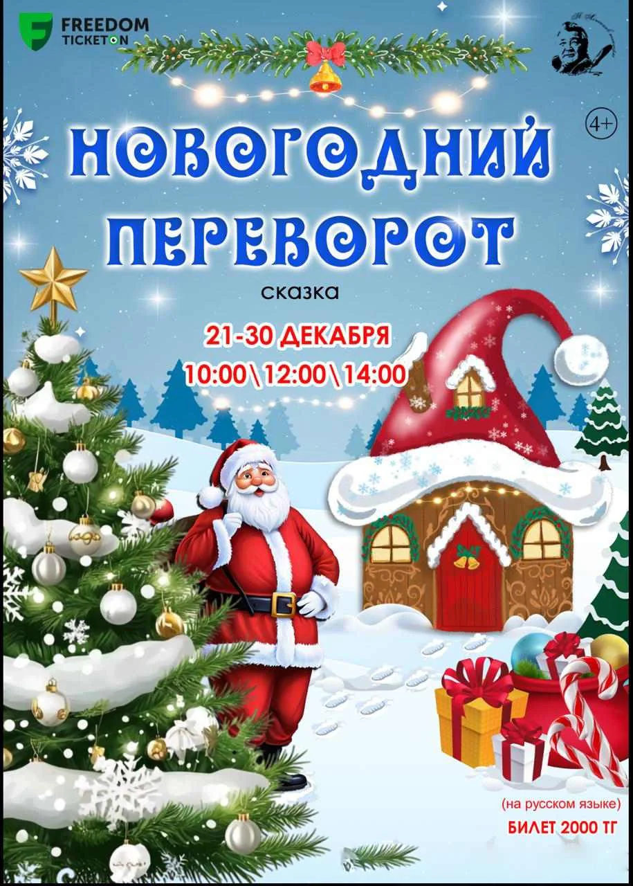Большая сцена: «Новогодний переворот». Яркое, захватывающее приключение, где герои вместе с Дедом Морозом отправляются в загадочный волшебный лес, полный чудес и испытаний.