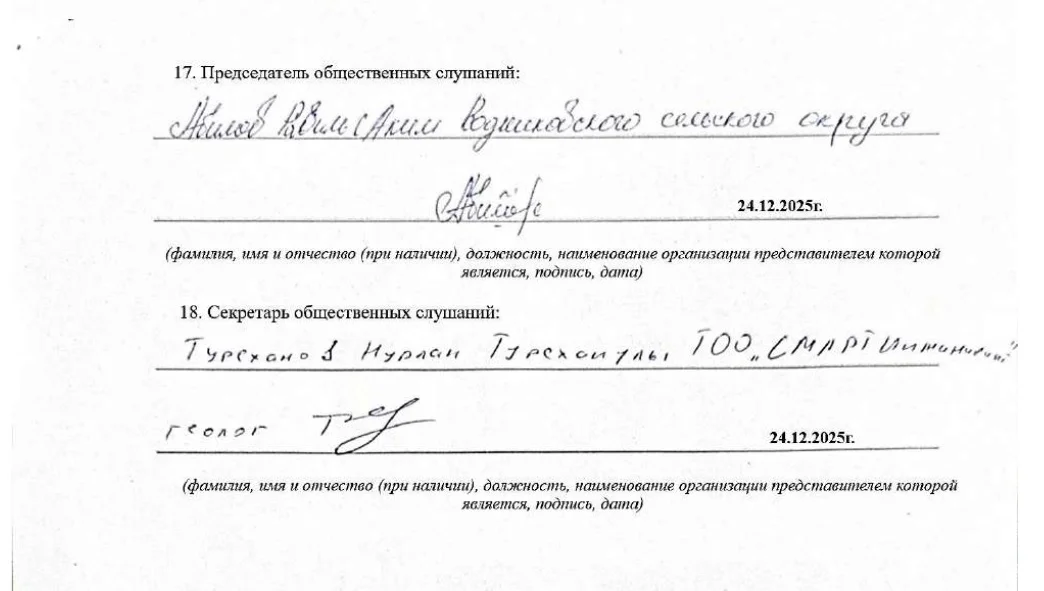 Копия последней страницы протокола общественных слушаний, проведенных в Родниковке 23 декабря. Протокол подписан акимом 24 декабря.
