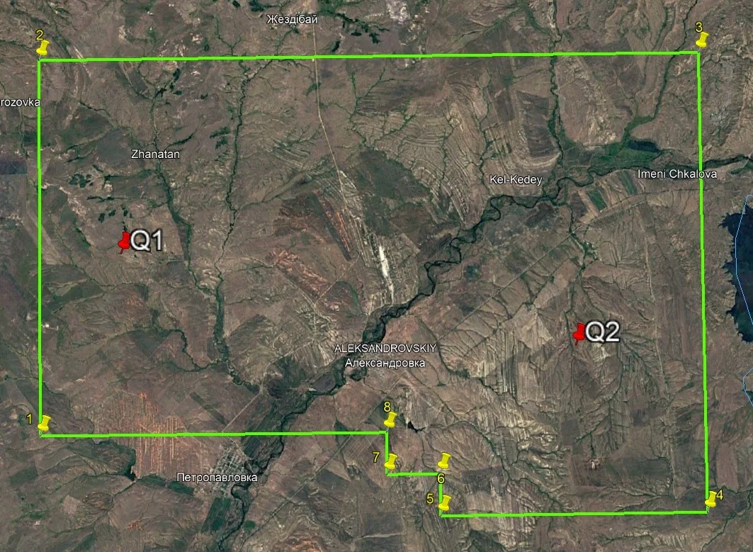 Участок «Каргалы», выданный министерством энергетики алматинской фирме. Q1, Q2 – места расположения поисковых скважин до корректировки проекта.
