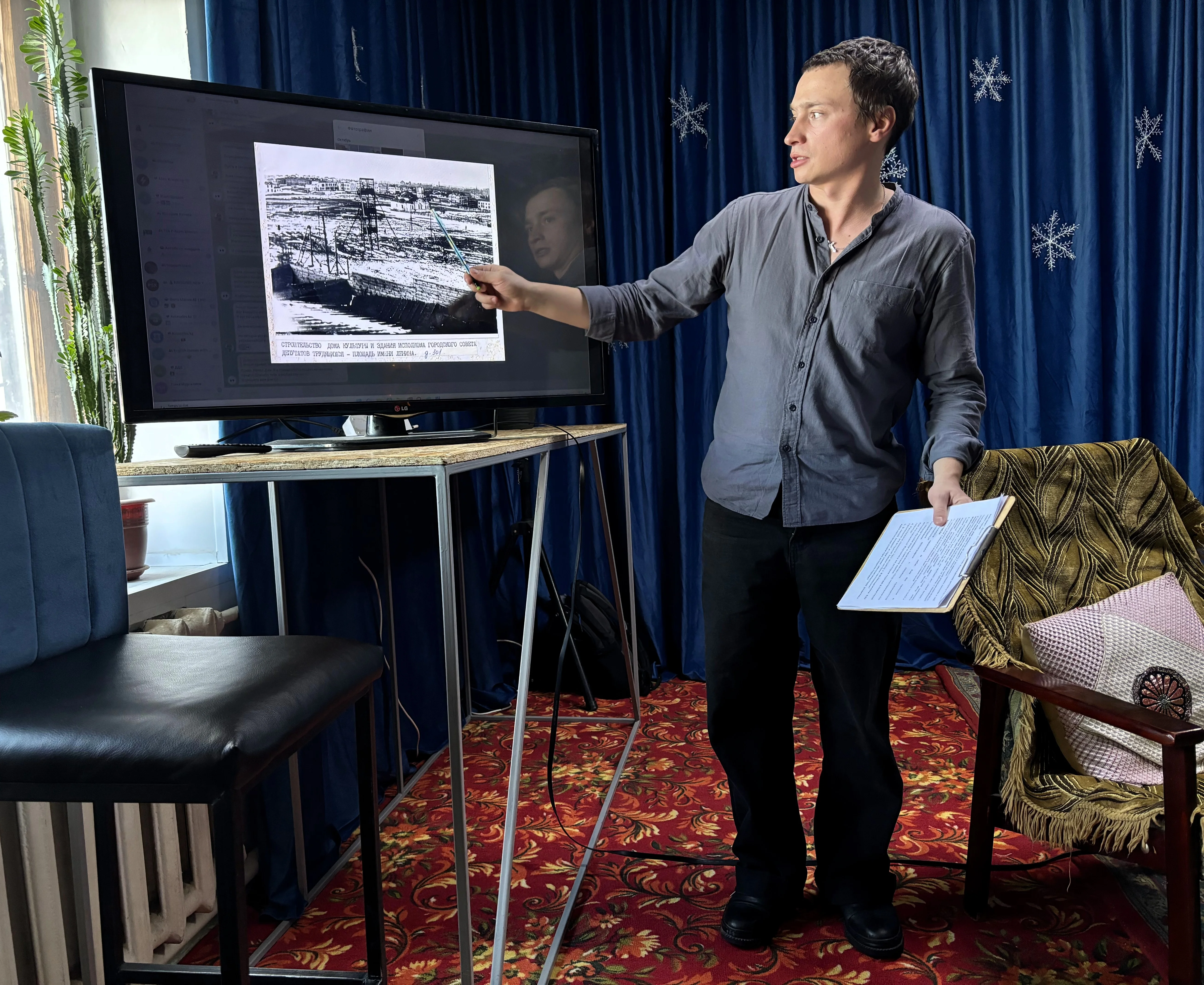 Никита Салов демонстрирует третий найденный фотоснимок, на котором храм запечатлен в окружении других строений.