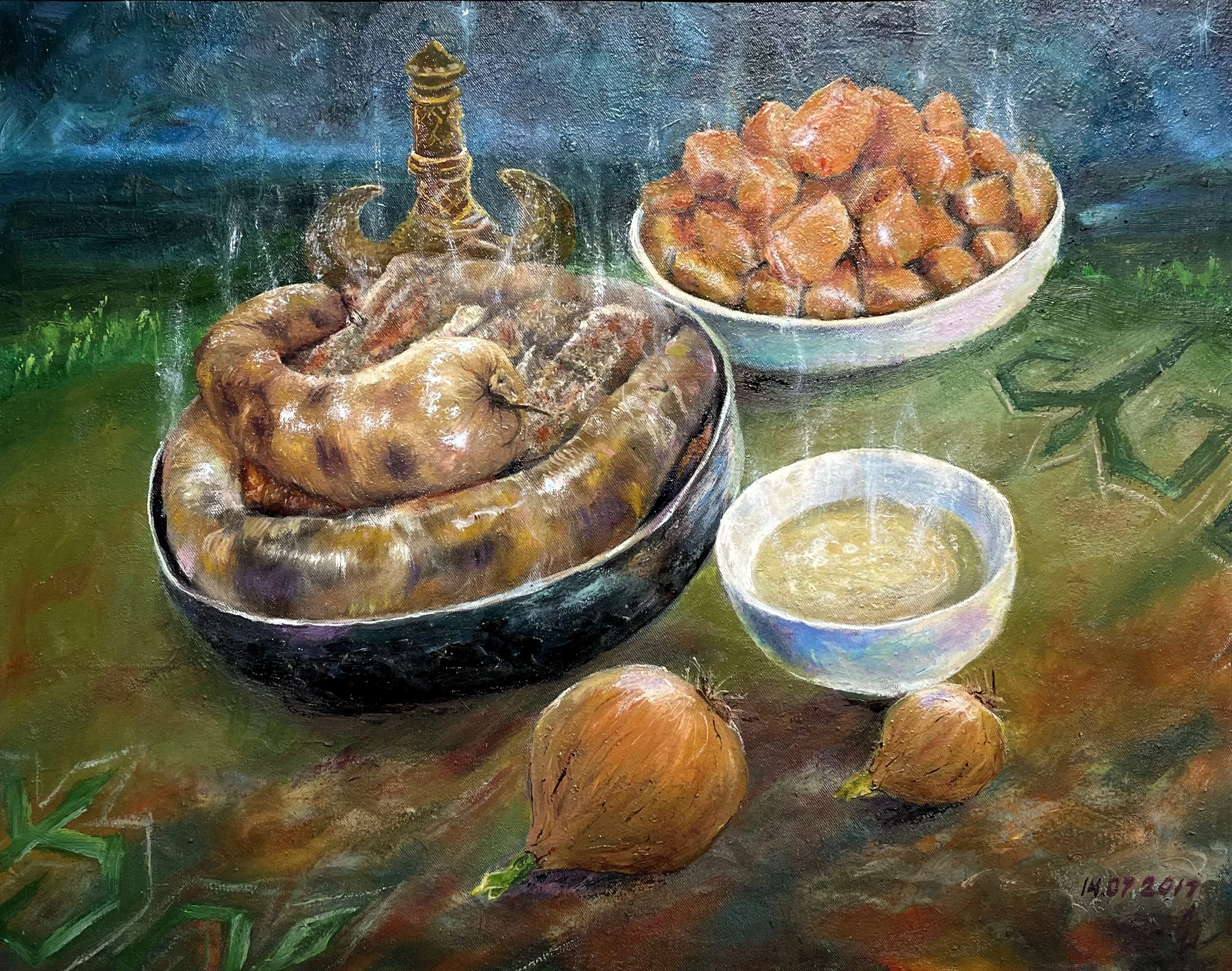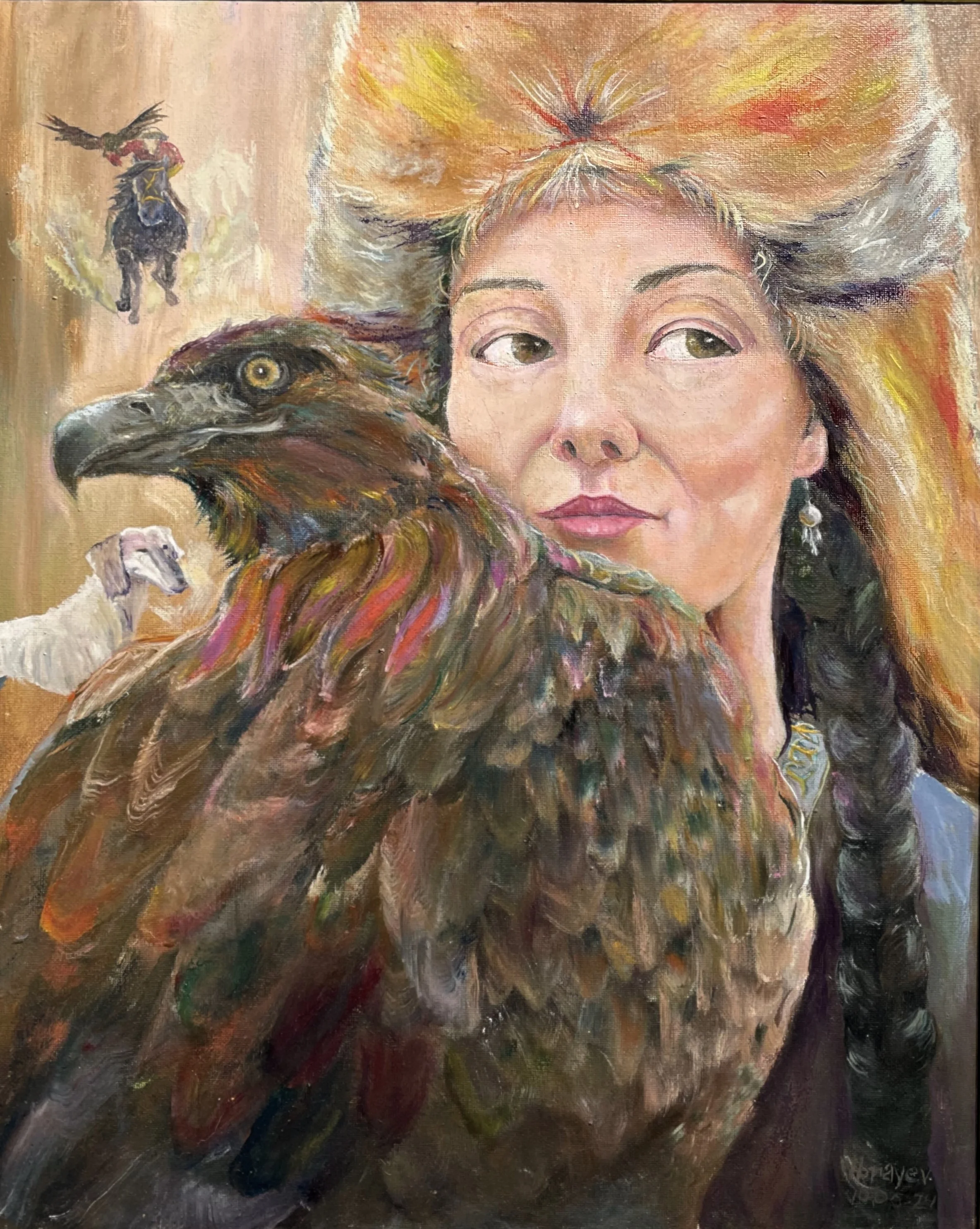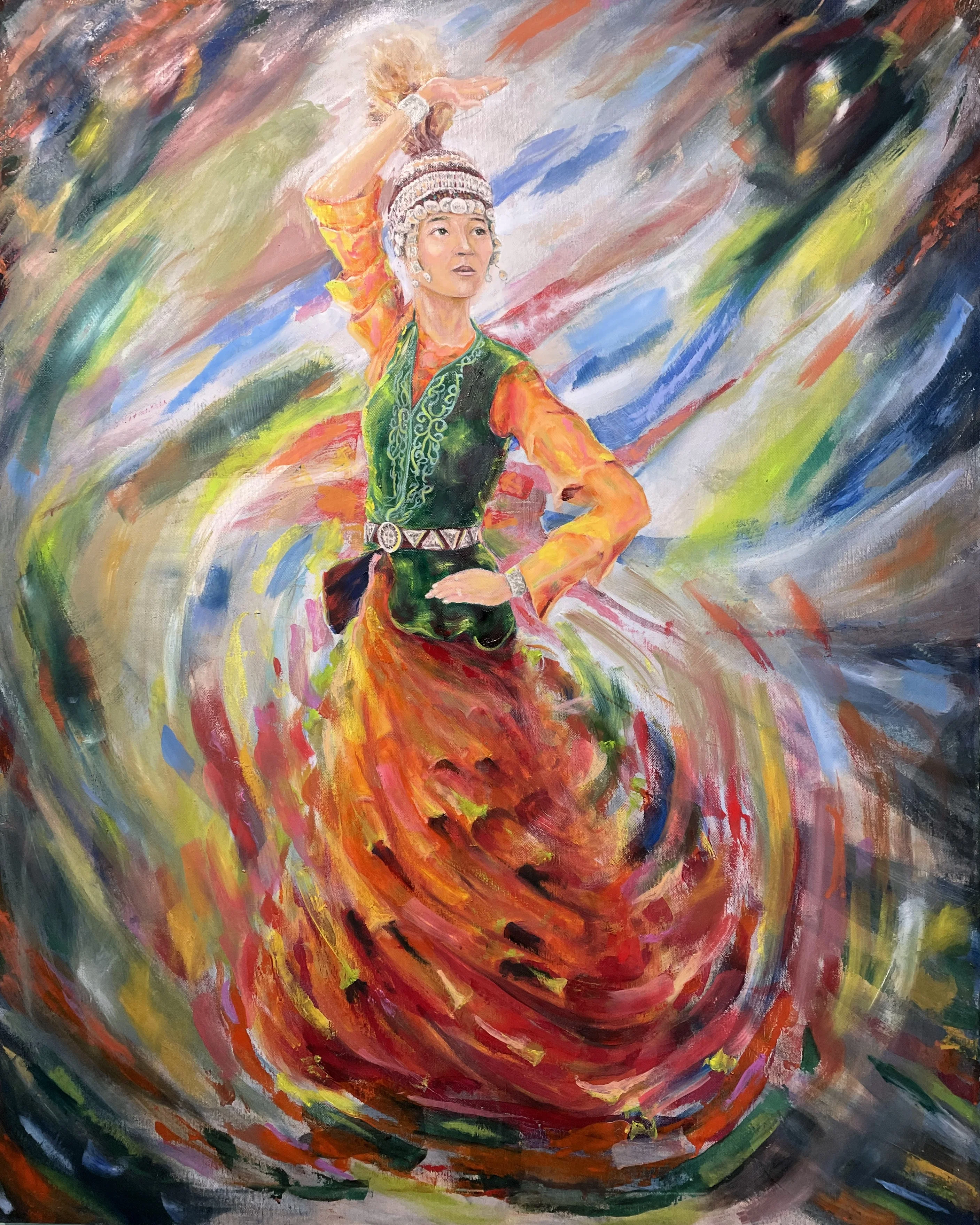 Портреты известных соотечественников - Алии Молдагуловой, Хиуаз Доспановой, Димаша Кудайбергенова - соседствуют с изображениями сельского быта, родных степей и посёлков, сценами охоты и образами животных. При жанровом разнообразии экспозиция воспринимается цельно: работы объединяют насыщенная цветовая палитра, внимание к деталям и выверенная работа со штрихом.