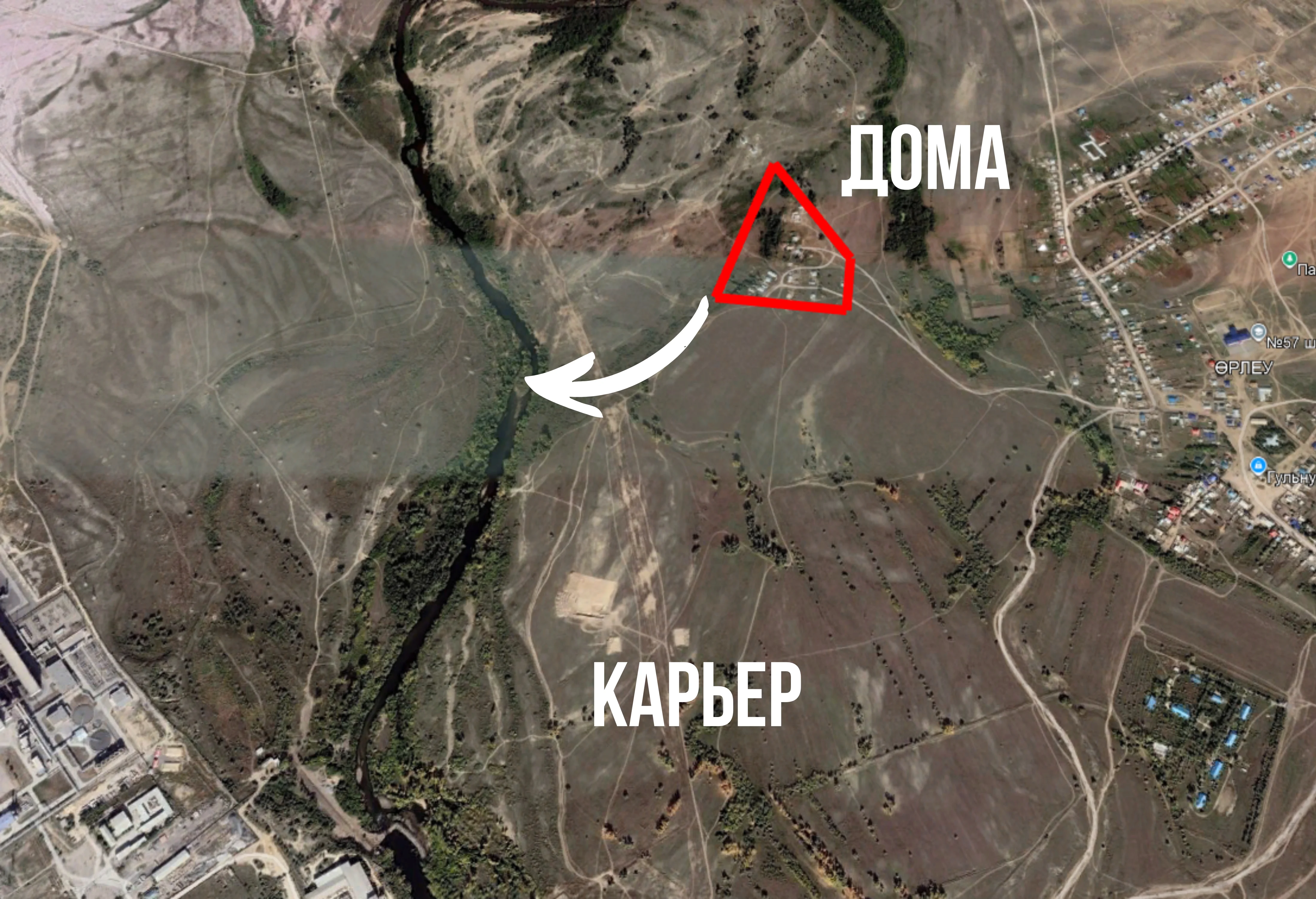 Со спутника видно, что в 2016 году карьер занимает небольшую площадь. Стрелка показывает, как приток Илека свободно соединялся с основным руслом.