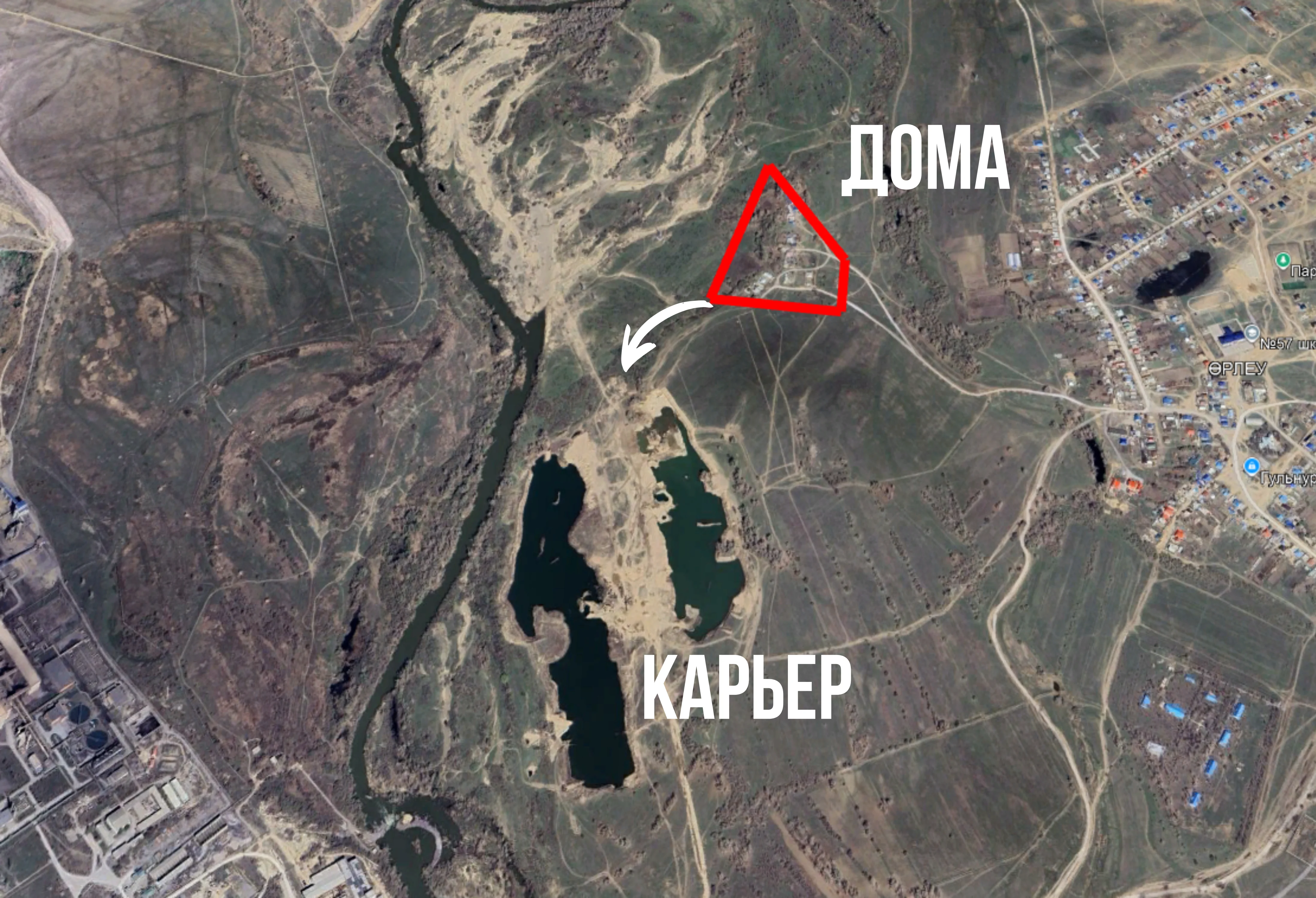 Орлеу потихоньку растет и развивается, но есть одна большая беда, о которой говорят все местные жители. Жилмассив окружили несколько карьеров, где компании активно добывают песок для строительства дорог и зданий.