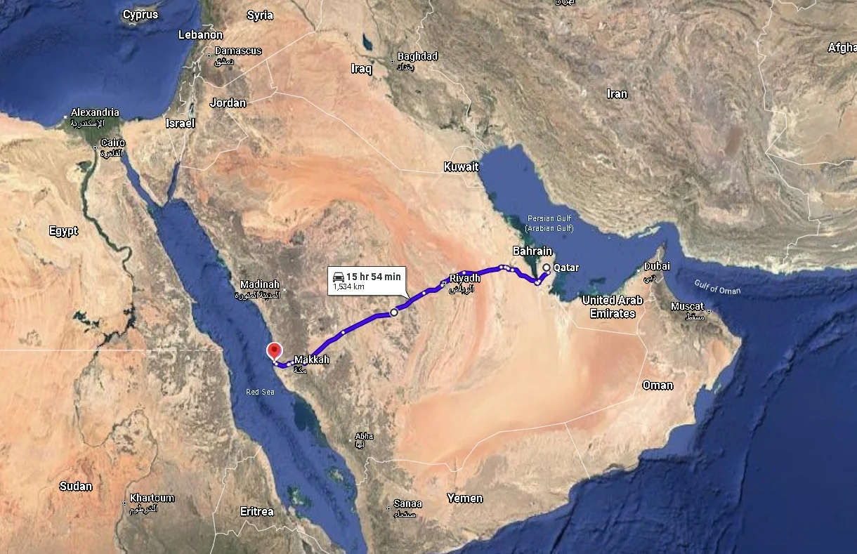 Из Катара, расположенного на берегу Персидского залива, как выяснил репортер «АТ», актюбинцев повезли в столицу Саудовской Аравии - Эр-Рияд. Оттуда маршрут проходит через пустыни до Джидды – города на побережье Красного моря. Таким образом дядя Гена с супругой, как и другие казахстанцы, должны пересечь весь Аравийский полуостров, включая его жаркие пустыни. Путь неблизкий – более 1,5 тысячи километров.