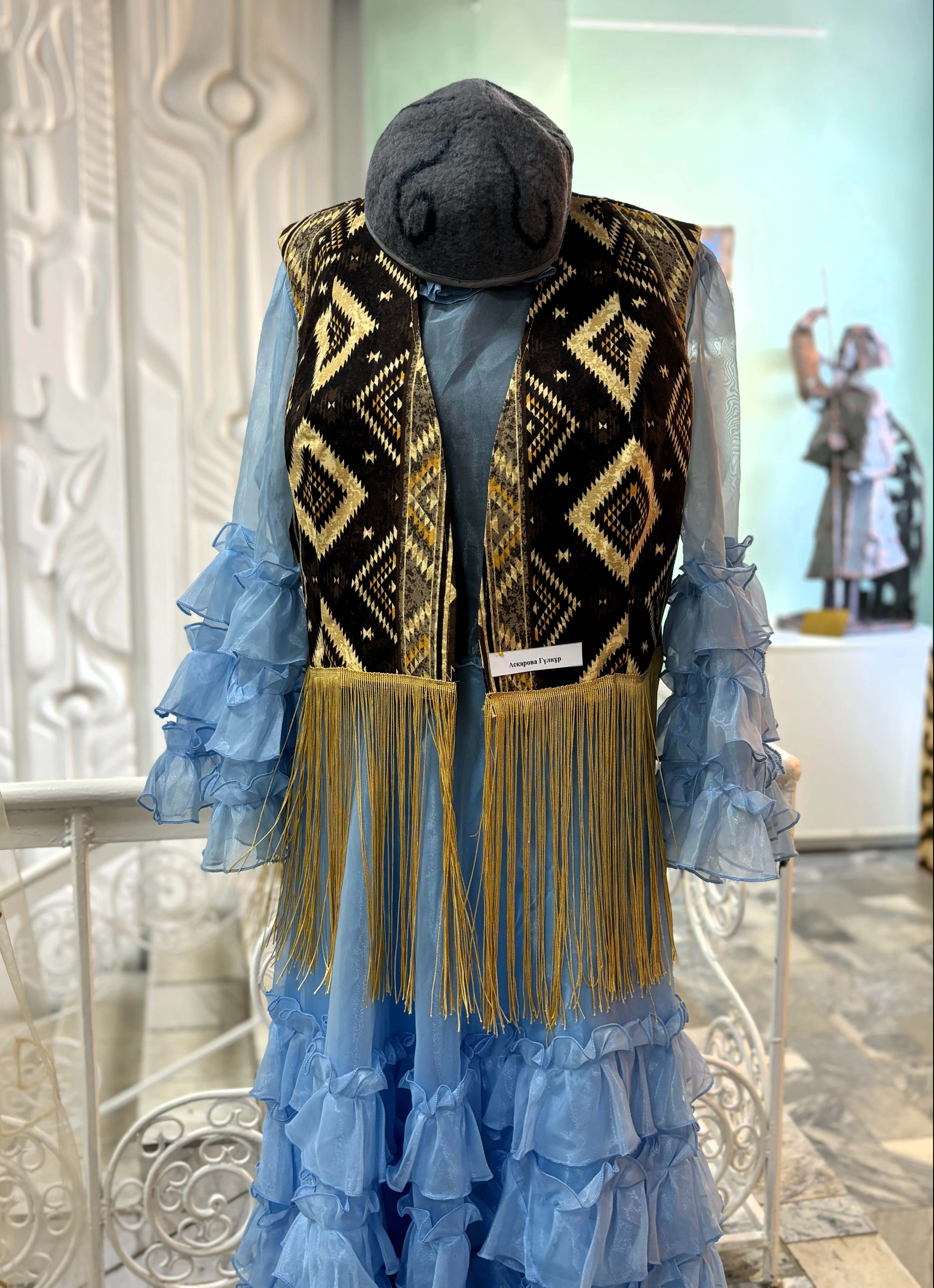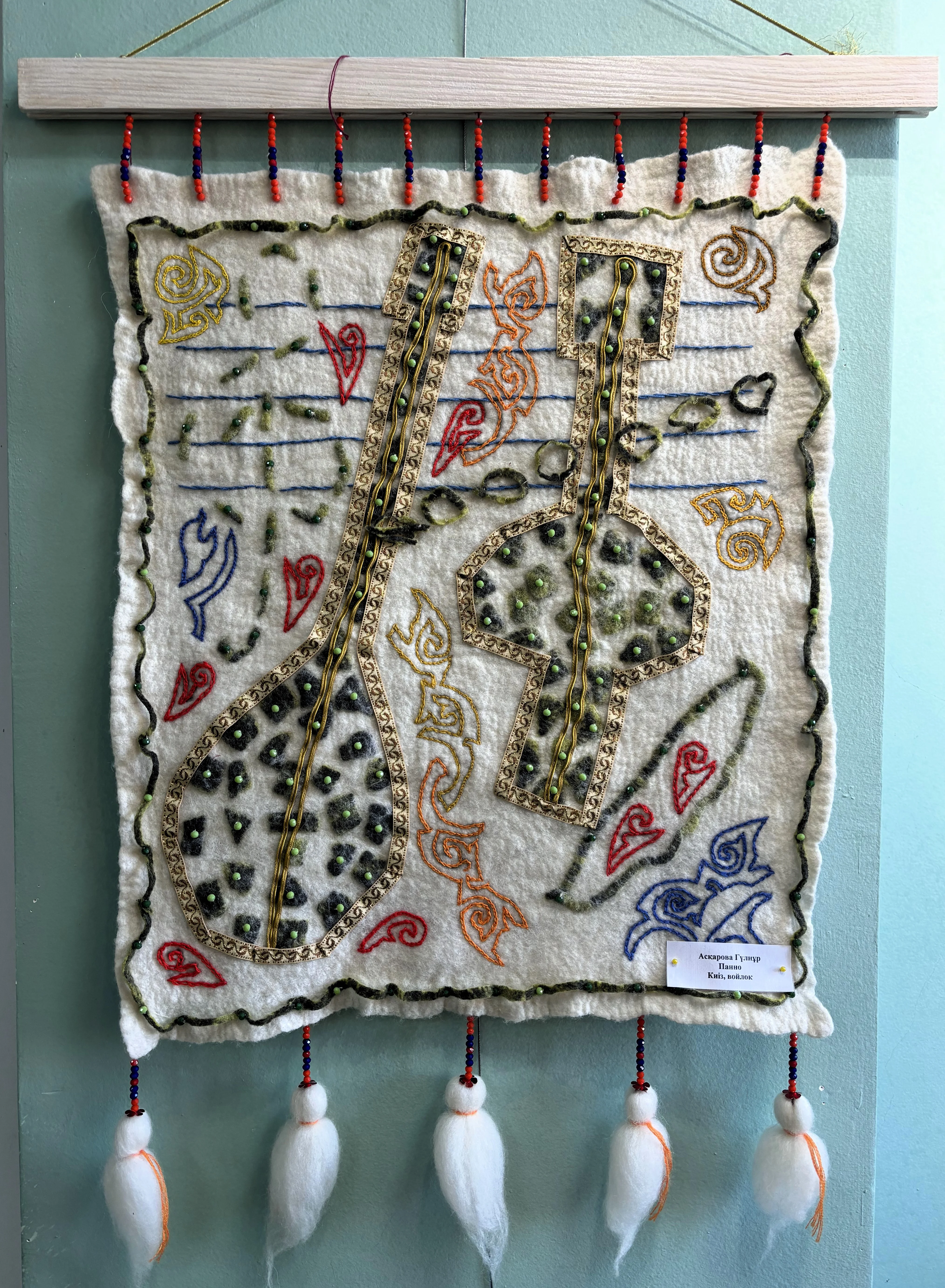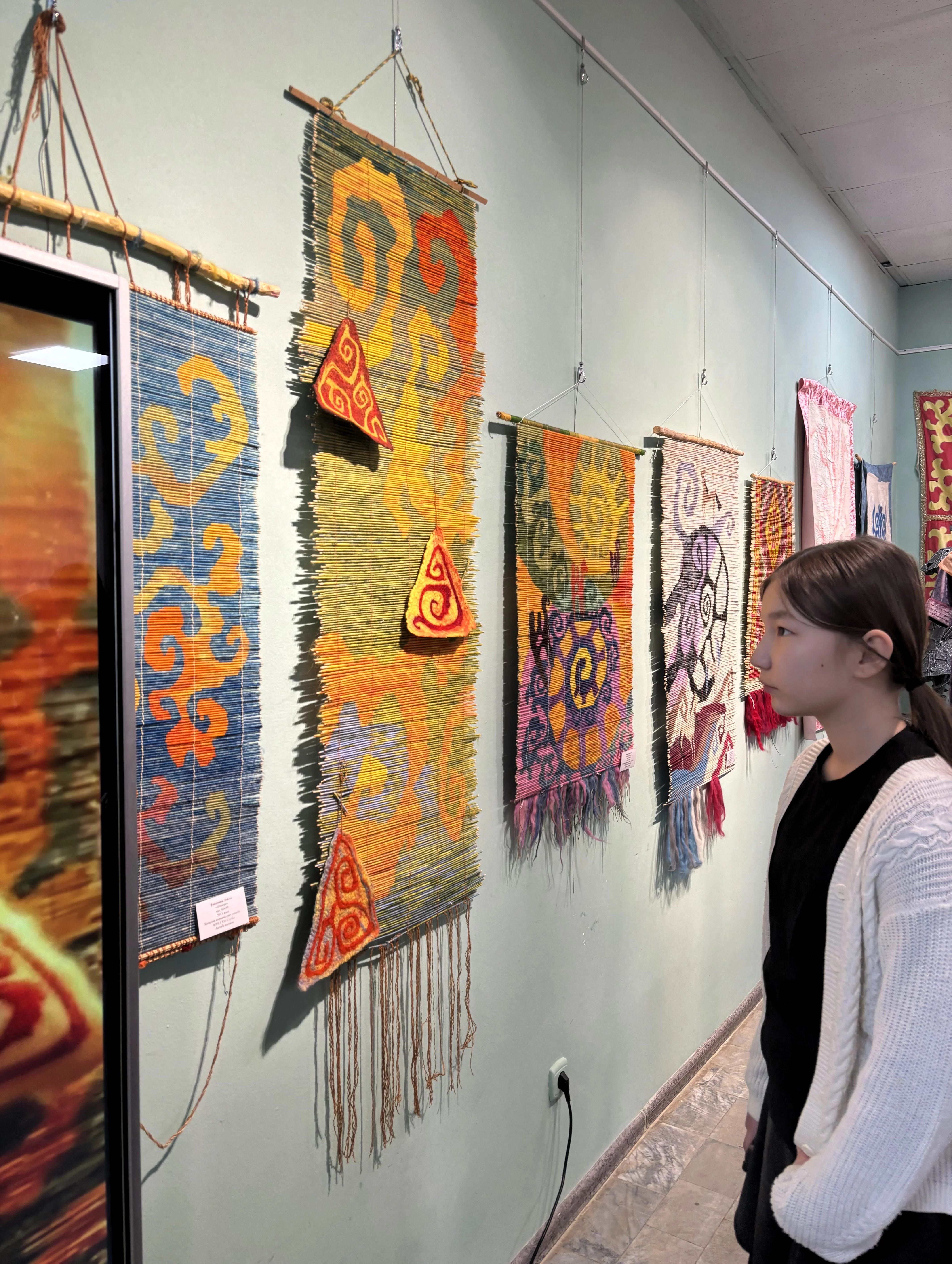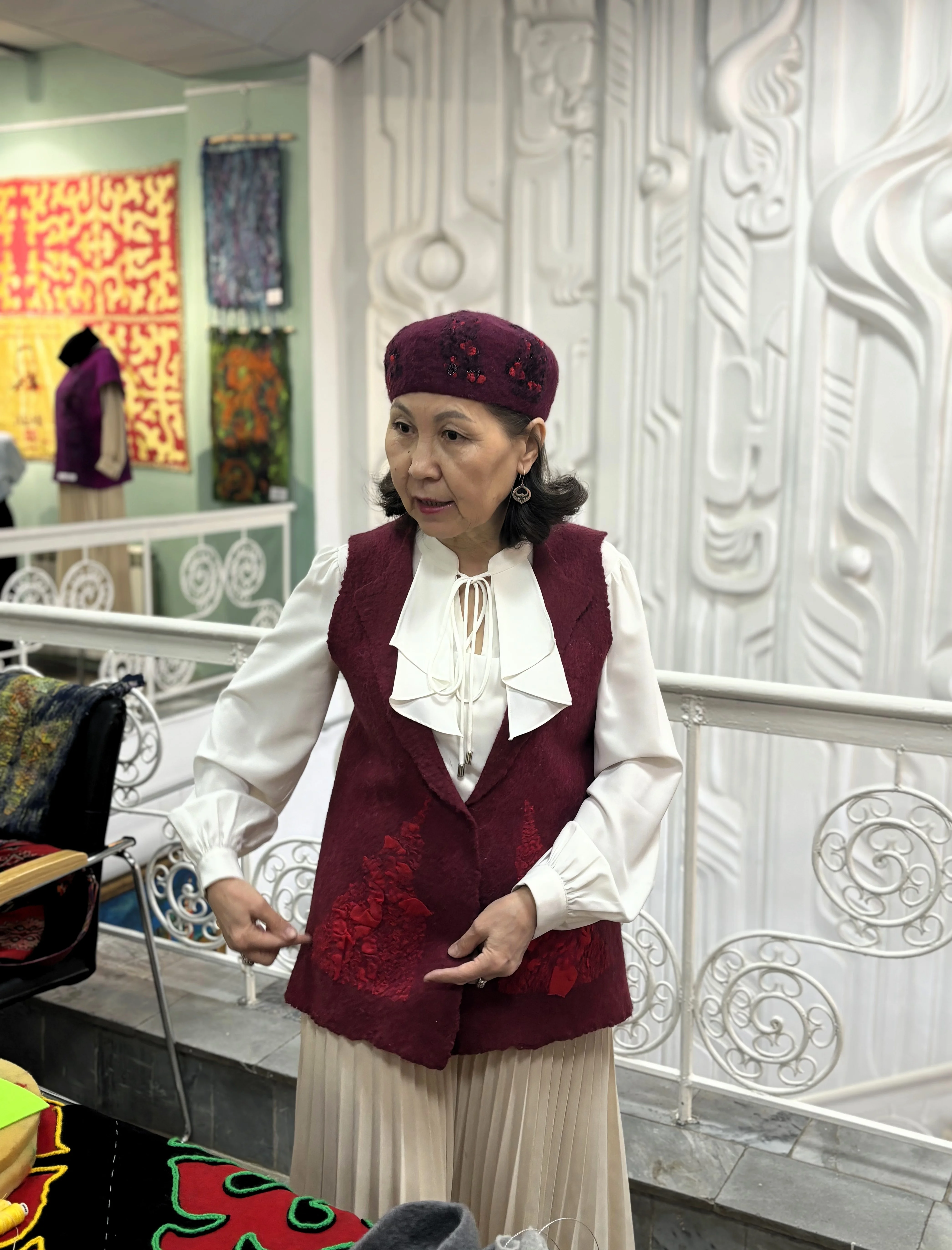 В зале - изделия из шерсти и войлока, текеметы и панно, авторские композиции, национальная одежда и аксессуары. Каждая вещь - это не стилизация под этнику, а внимательная работа с материалом и орнаментом. Войлок здесь не музейный экспонат, а живой, тёплый и пластичный материал.