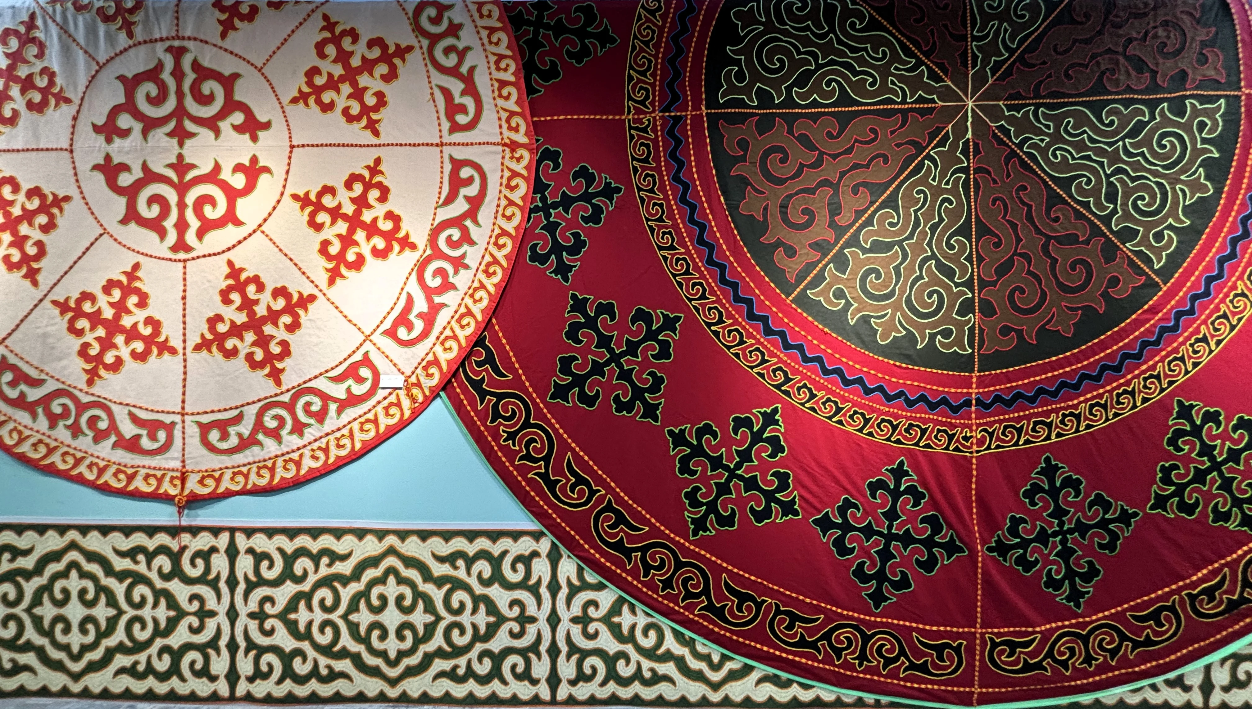 Размер впечатляет: первый сырмак достигает пяти метров в диаметре и способен занять пространство целой юрты. В зале музея их пришлось разместить частично - помещение не позволяет развернуть полотна полностью.