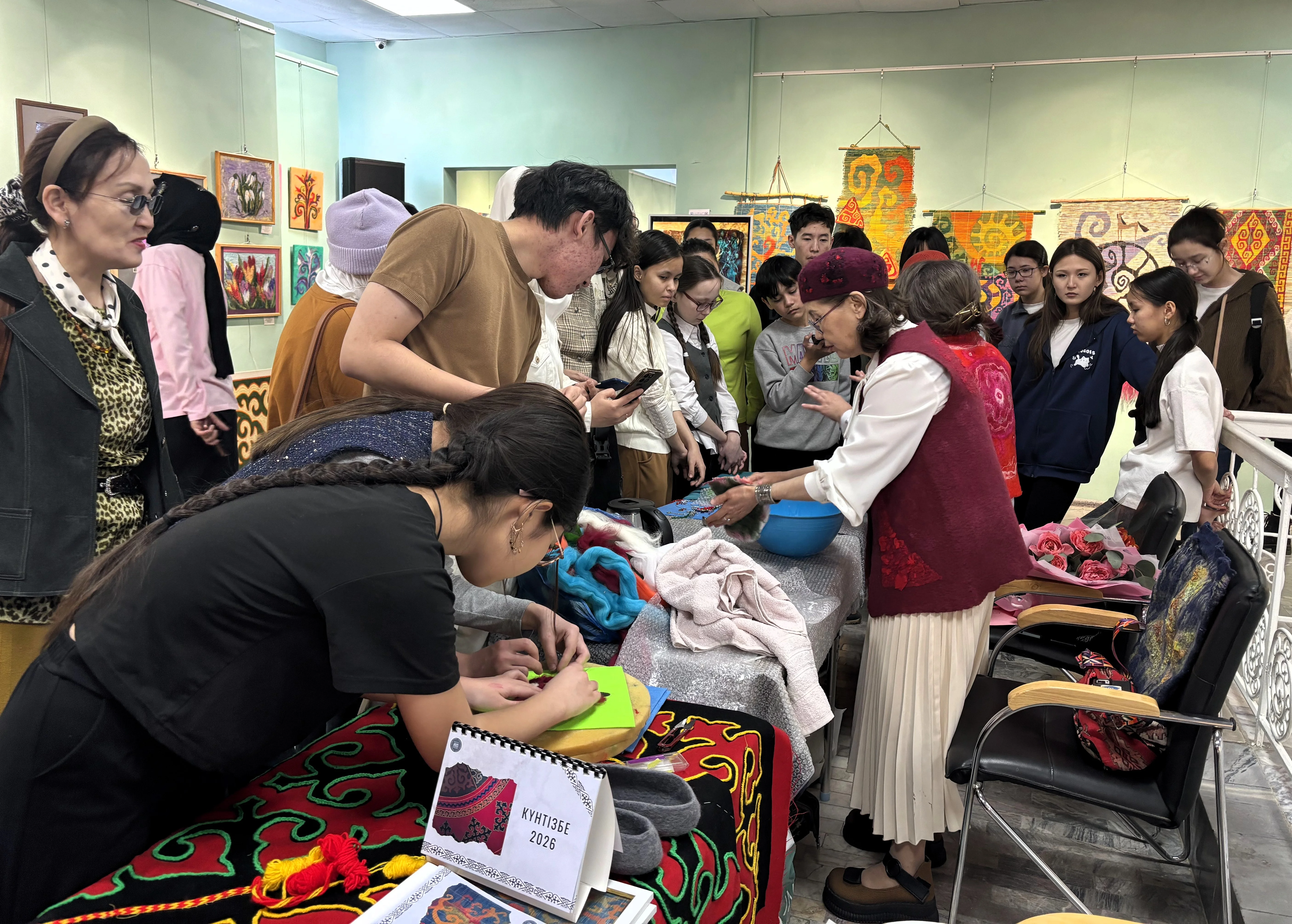 На открытие пришли друзья и коллеги мастериц, преподаватели и ученики городского художественного лицея. Живая музыка на кобызе и жетыгене добавила атмосфере степной глубины - контраст особенно ощущался на фоне февральского холода за окнами.