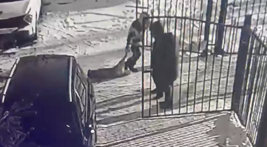 Обездвиженную (или уже мертвую) собаку отловщик грубо волочит по земле. Скриншот с записи камеры видеонаблюдения одного из домов.