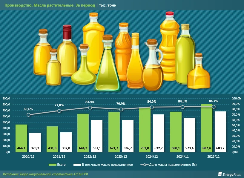 Данные по росту производства подсолнечного масла в Казахстане разнятся. По данным ассоциации, за 2025 год были произведены рекордные 752 тысячи тонн масла, что в 2,3 раза больше, чем в 2021 году.