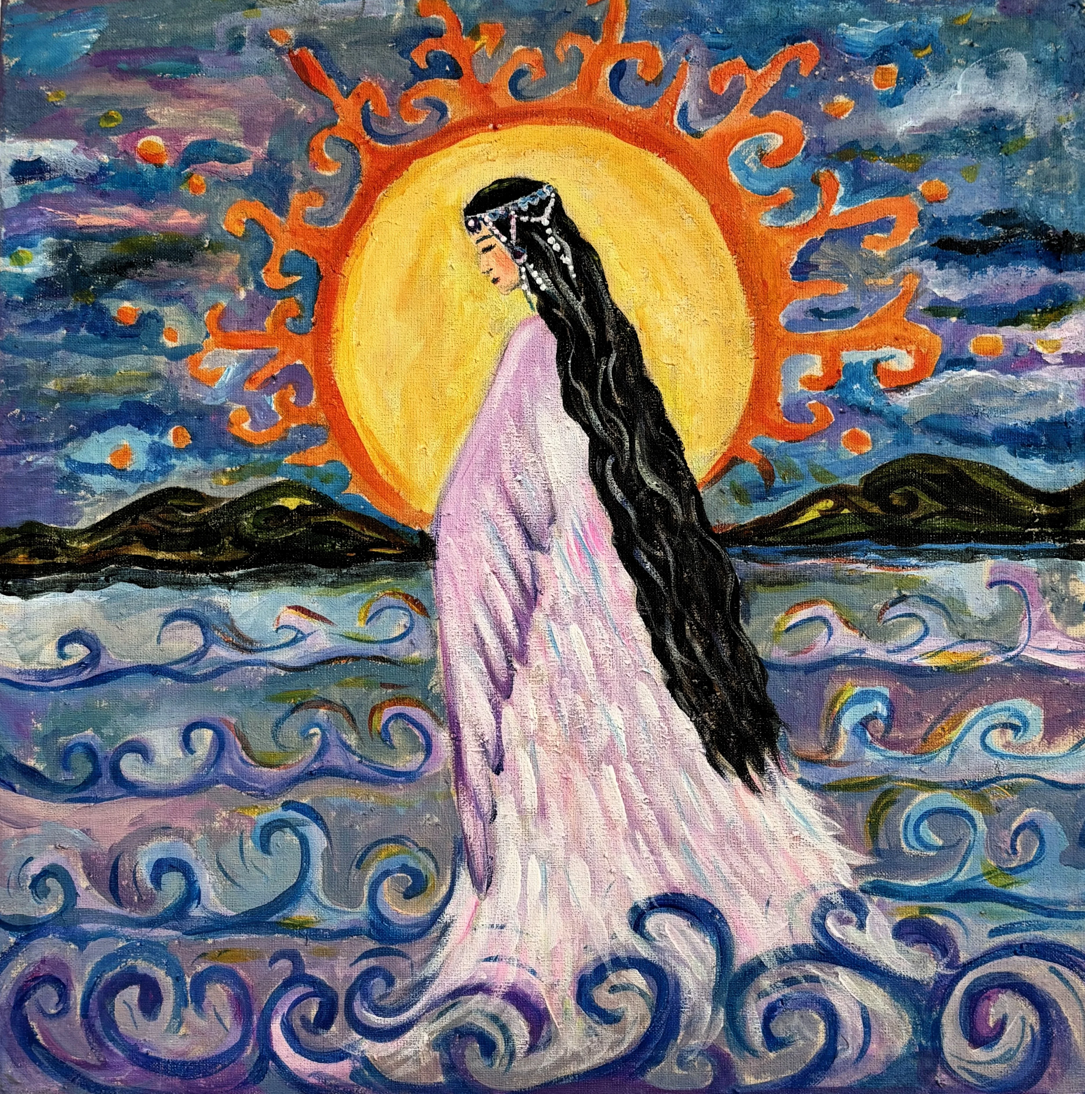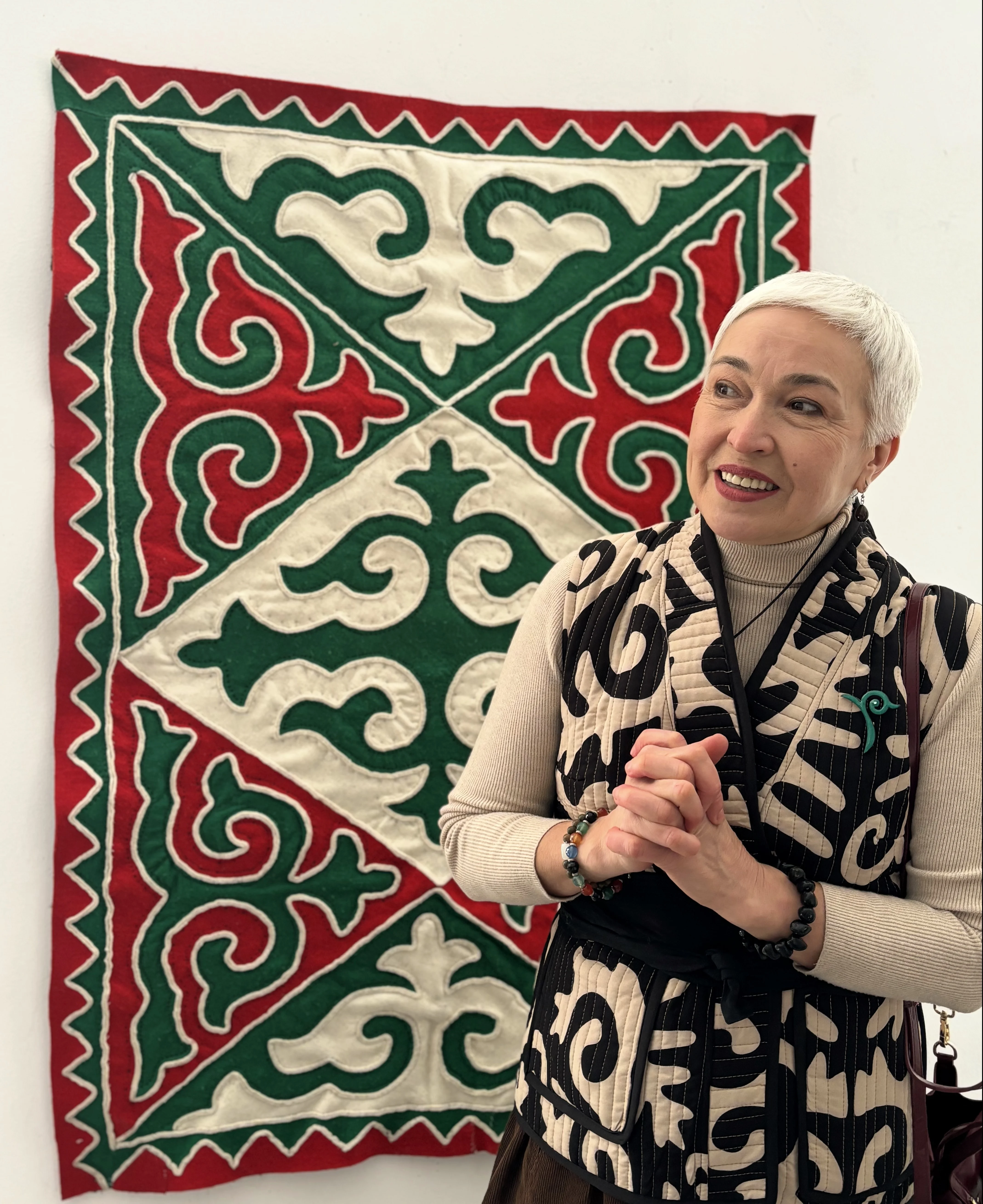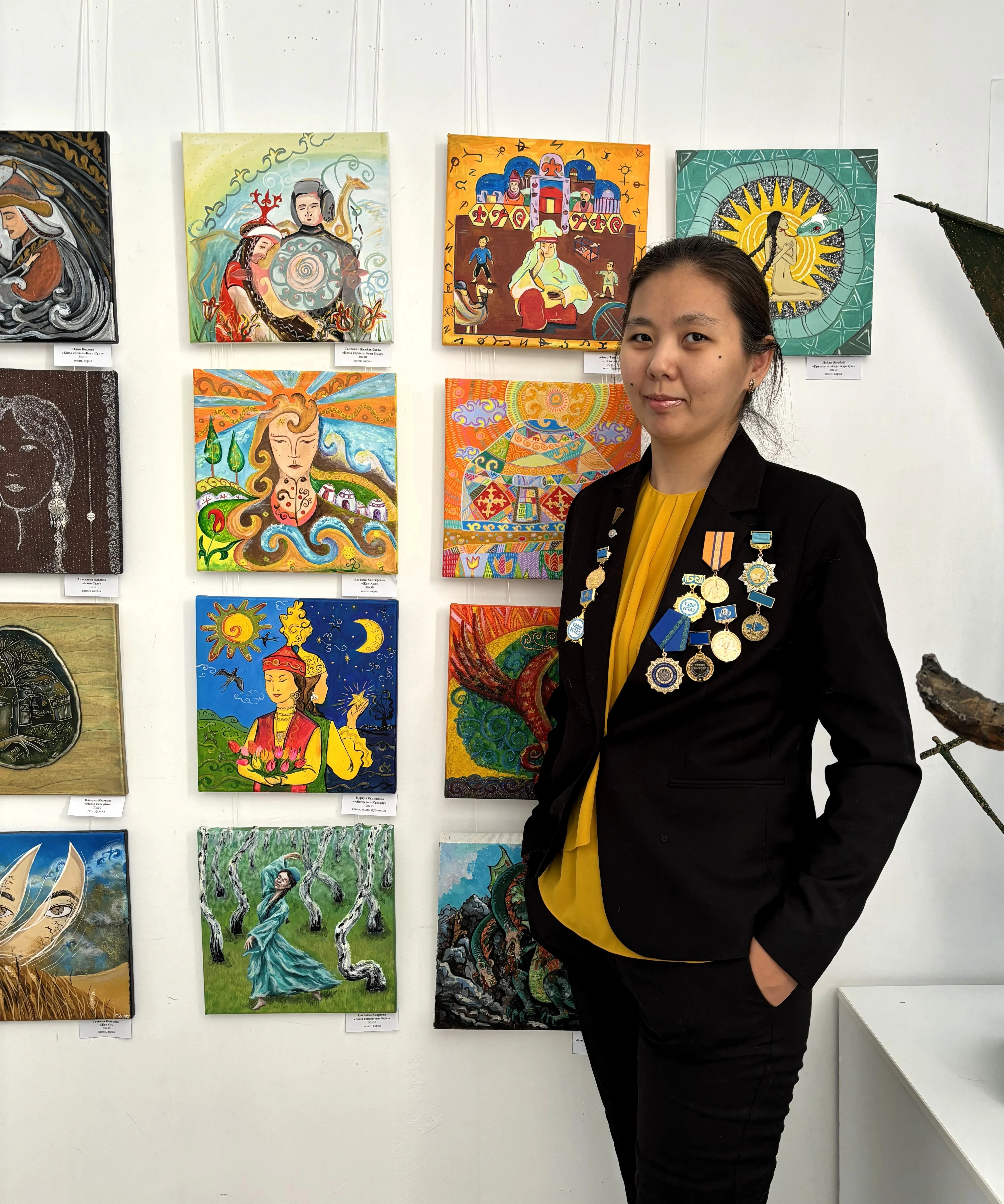 - Поздравляю всех с праздником! Моя работа «Умай Ана» посвящена покровительнице женщин и детей. Тема семьи для меня ключевая, и эта картина - о ней. А изображение на пиджаке - моя работа из войлока, аппликация. Чем-то напоминает портрет моей дочери, такая же светлоглазая, - поделилась автор работ.