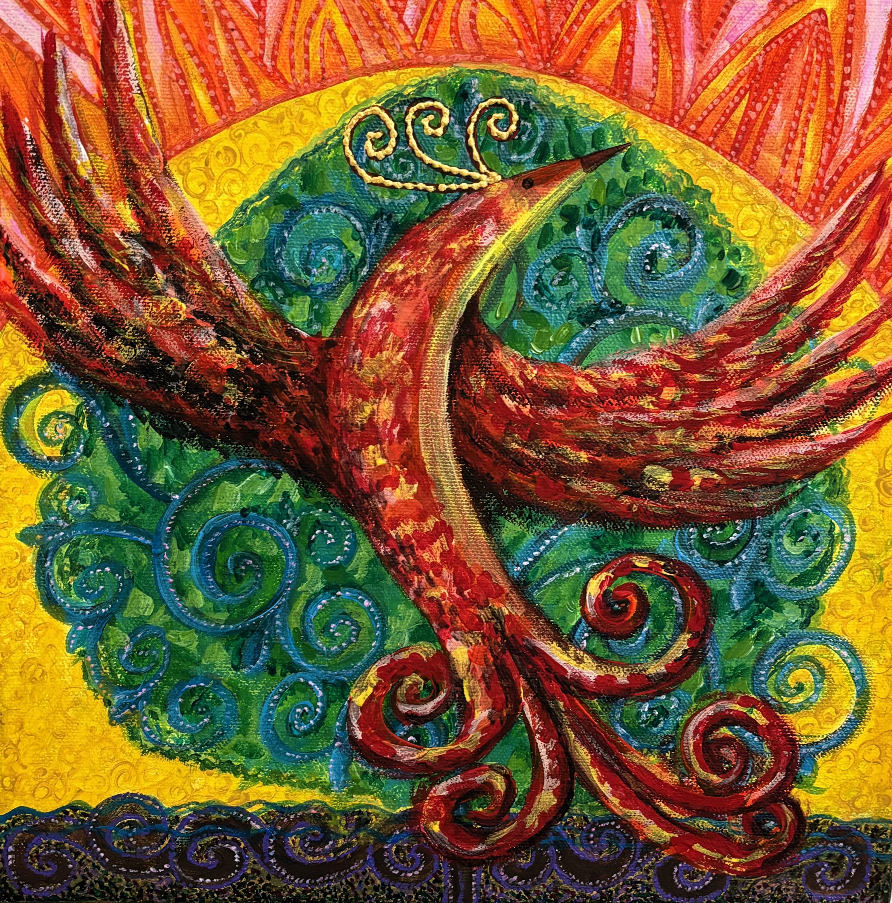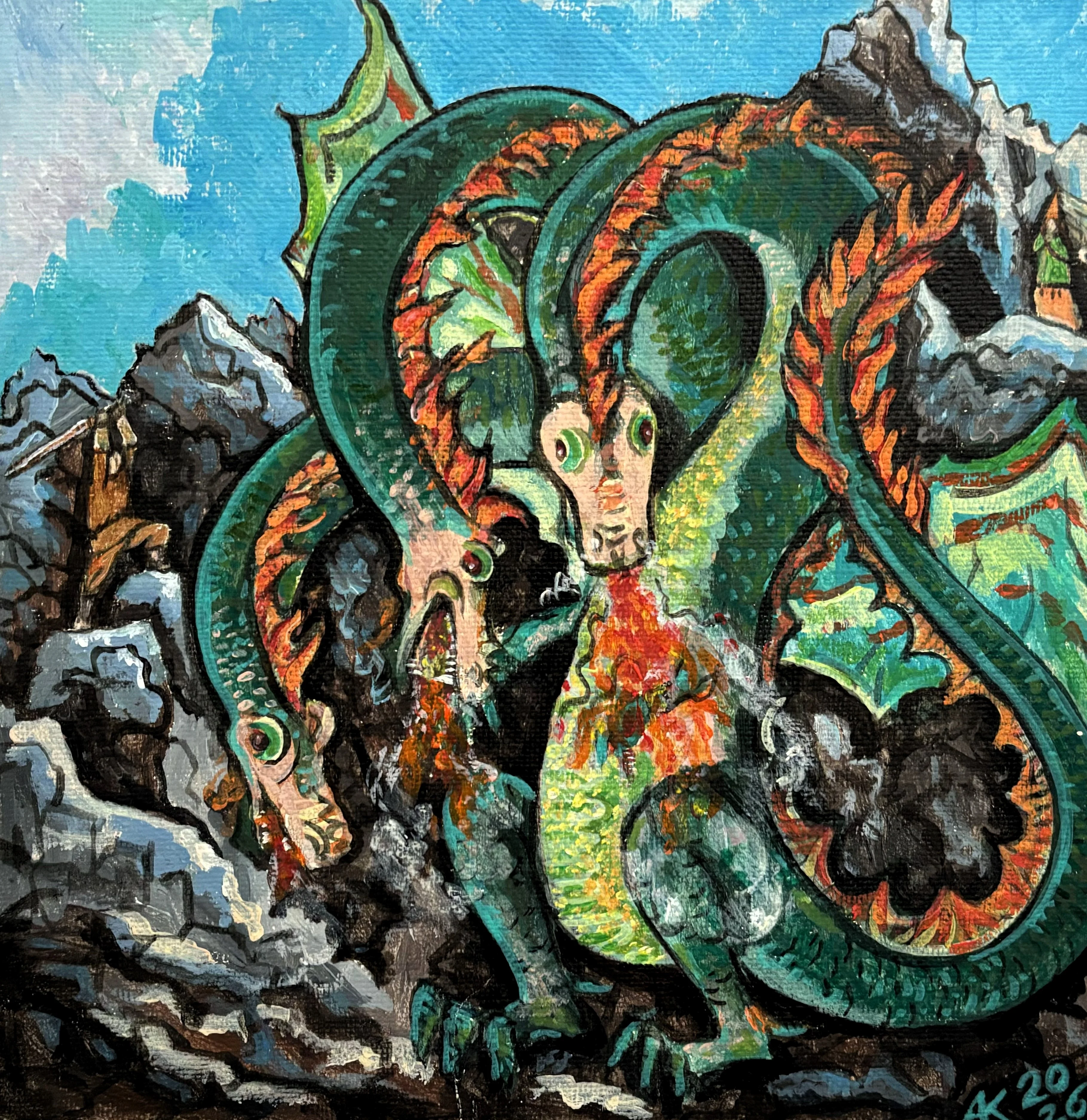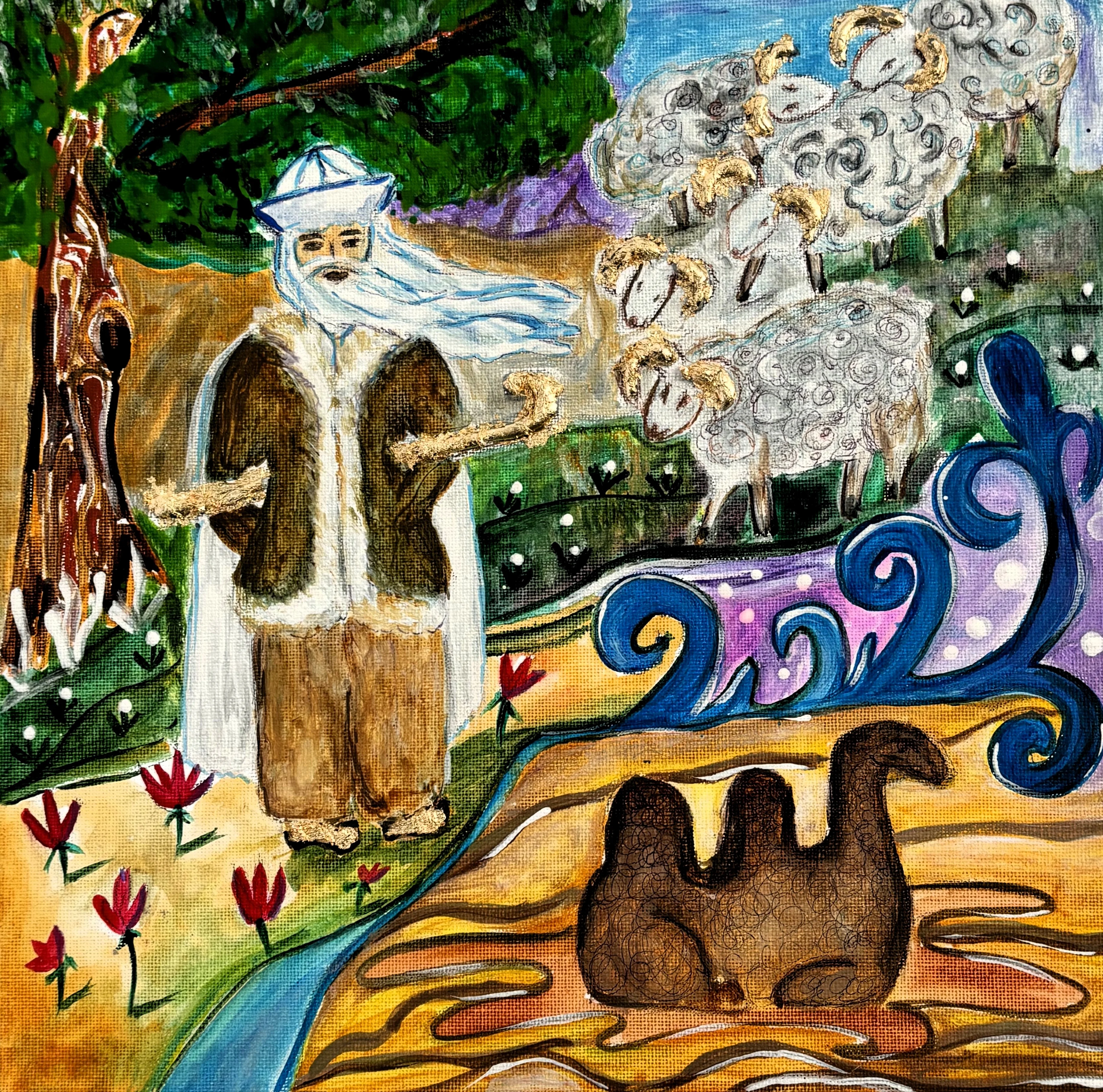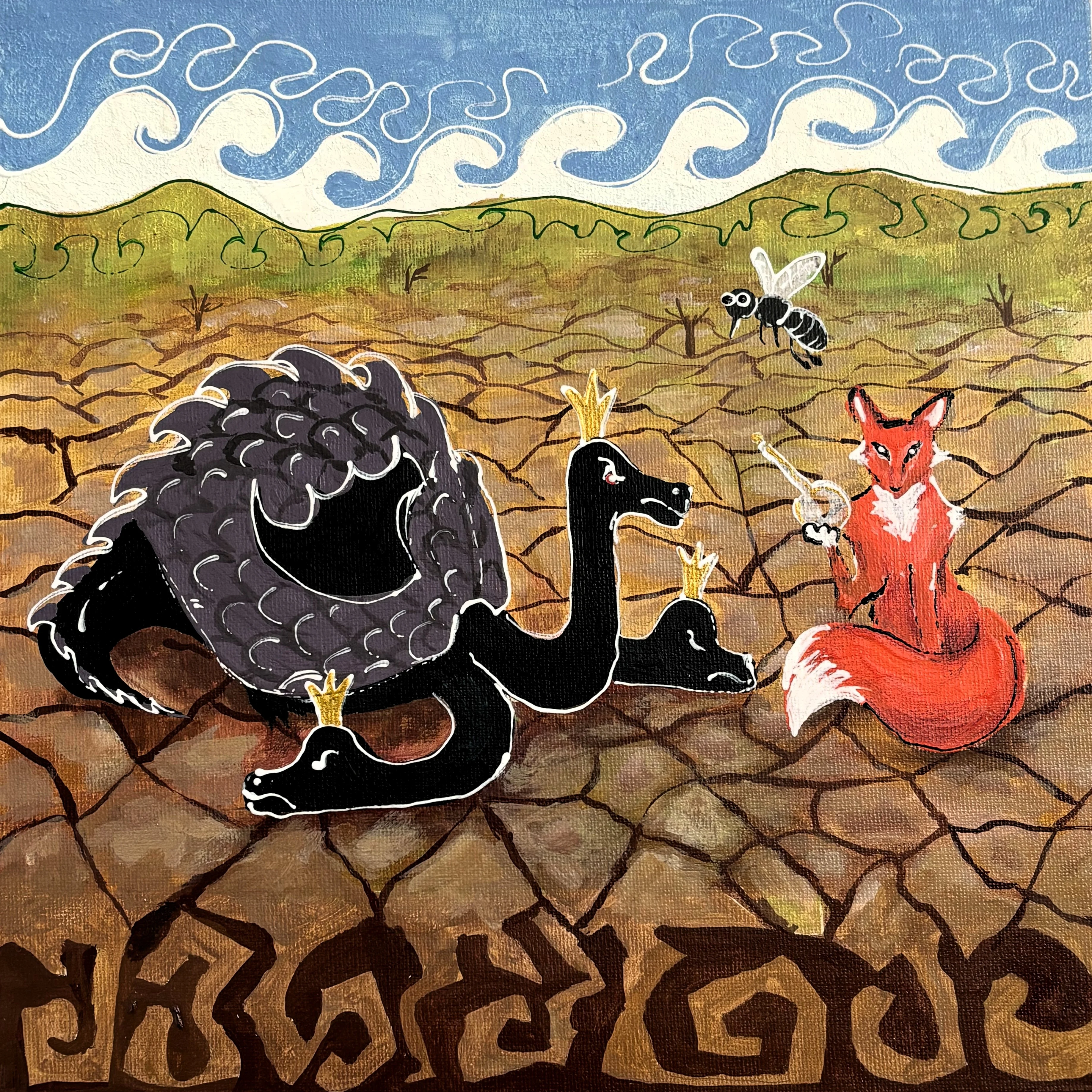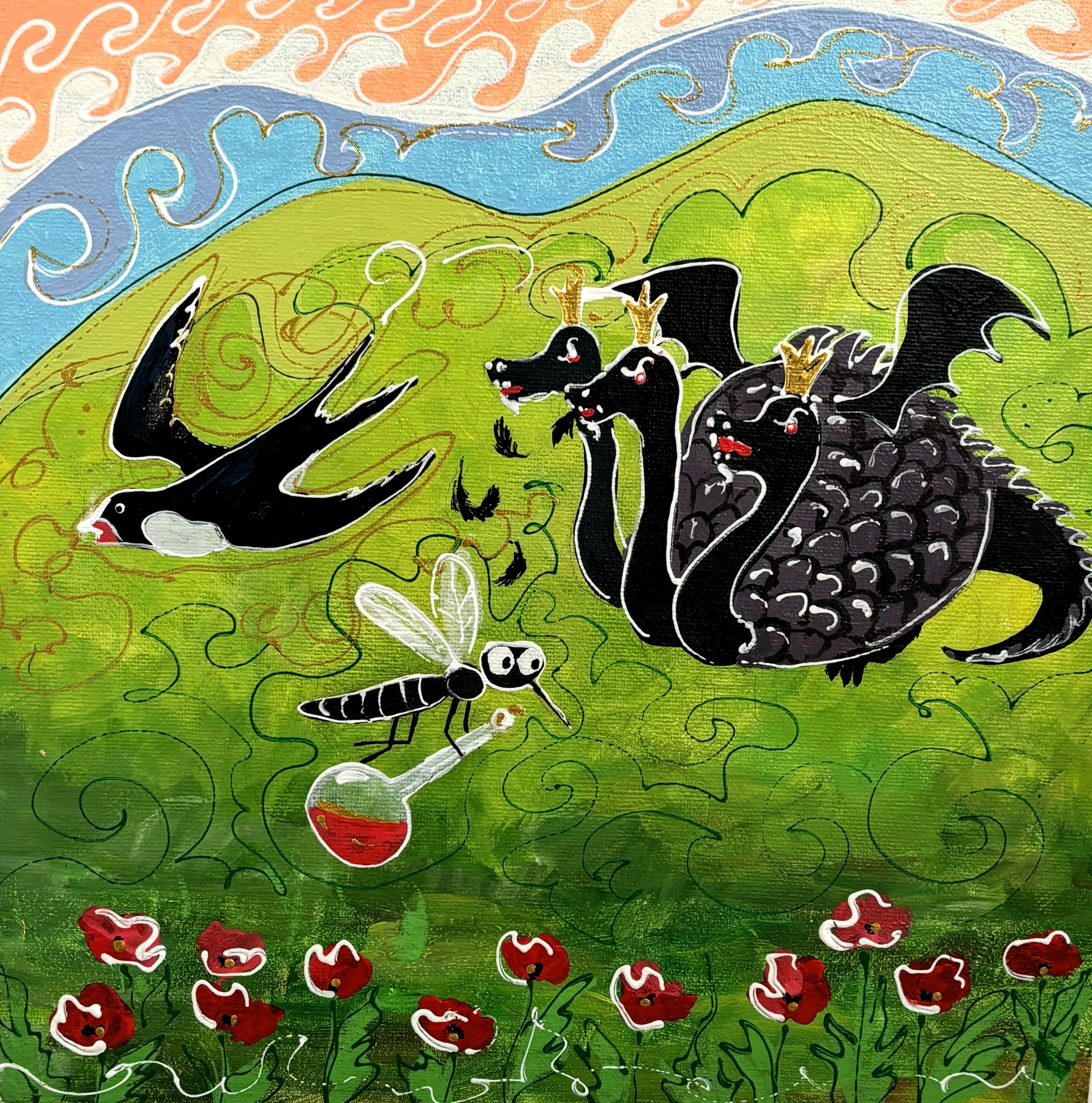 Где-то появляется мудрая птица Самрук - символ солнца и счастья, обитающая на вершине Байтерека. Рядом - история Козы Корпеш и Баян Сулу в интерпретации Юлии Козловой. Отдельно выделяется полиптих Камилы Жубатхан из четырёх работ. В нём художница пересказывает легенду о ласточке с раздвоенным хвостом. По преданию, когда миром правил змей Айдахар, питавшийся кровью, храбрая ласточка защитила людей. Ей удалось спастись, но дракон успел схватить её за хвост - так и появилась эта особенная примета.