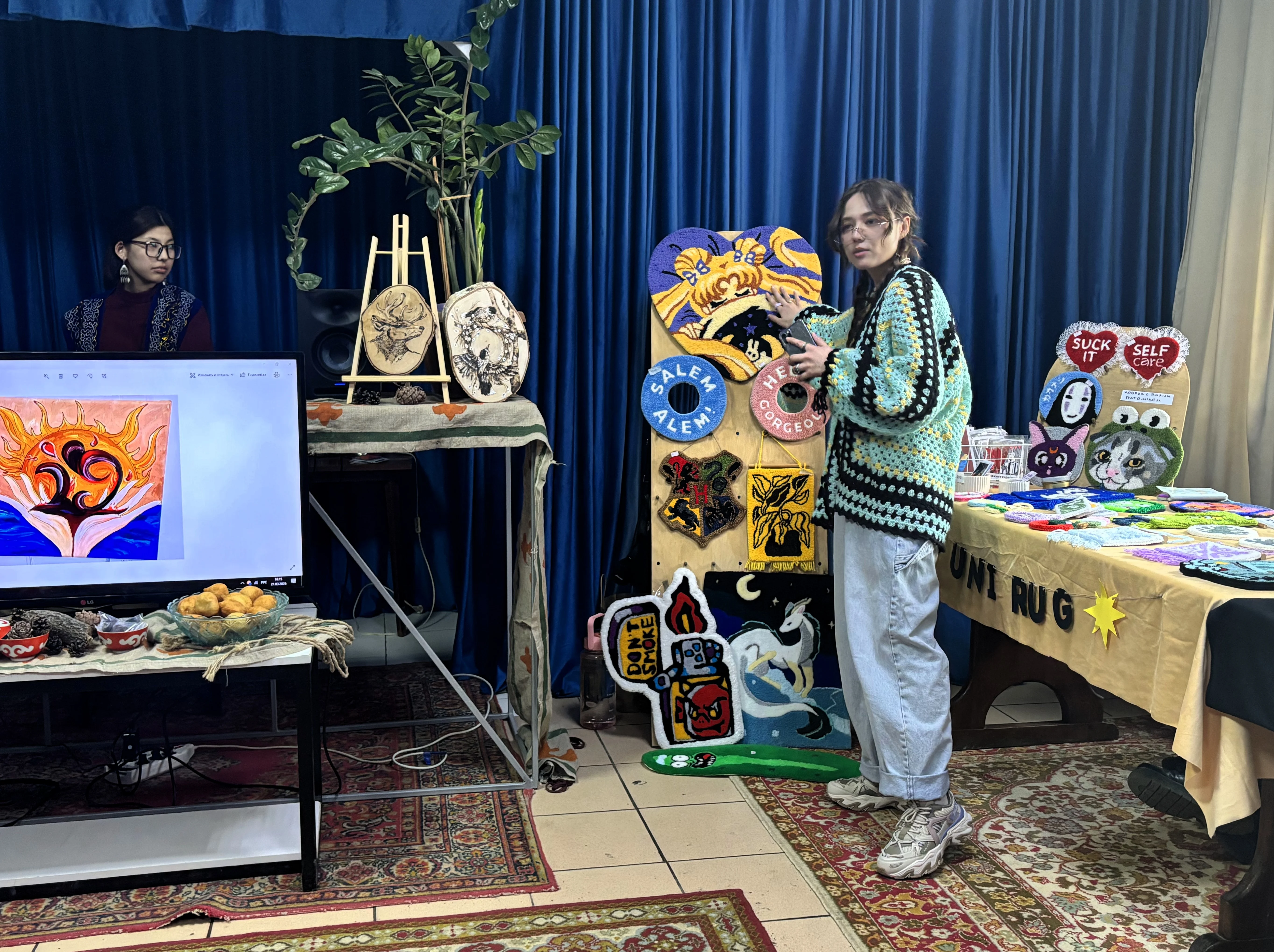 Под легкие биты диджея посетители переходили от столов с украшениями к стенам с живописью и графикой, от открыток к коврам ручной работы. Теснота не мешала, а скорее наоборот, добавляла ощущение камерности и уюта.