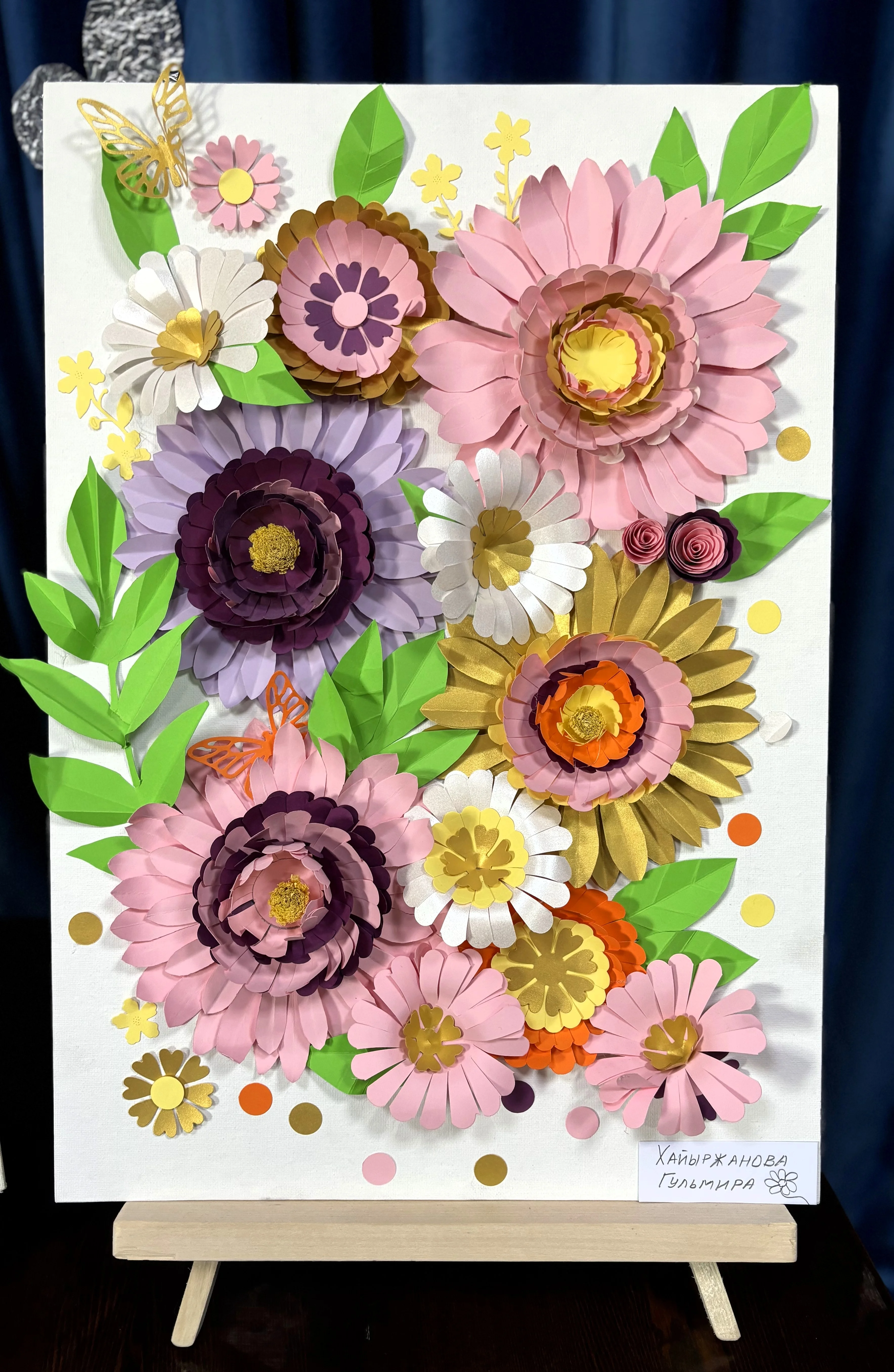 - Большое спасибо за приглашение. Моя работа - цветочная, она про настроение, про легкость и воздух. Помимо преподавания, я увлекаюсь аппликацией. Наверное, потому что работаю с детьми, это чувство весеннее, само идет в руки, - поделилась Гульмира.