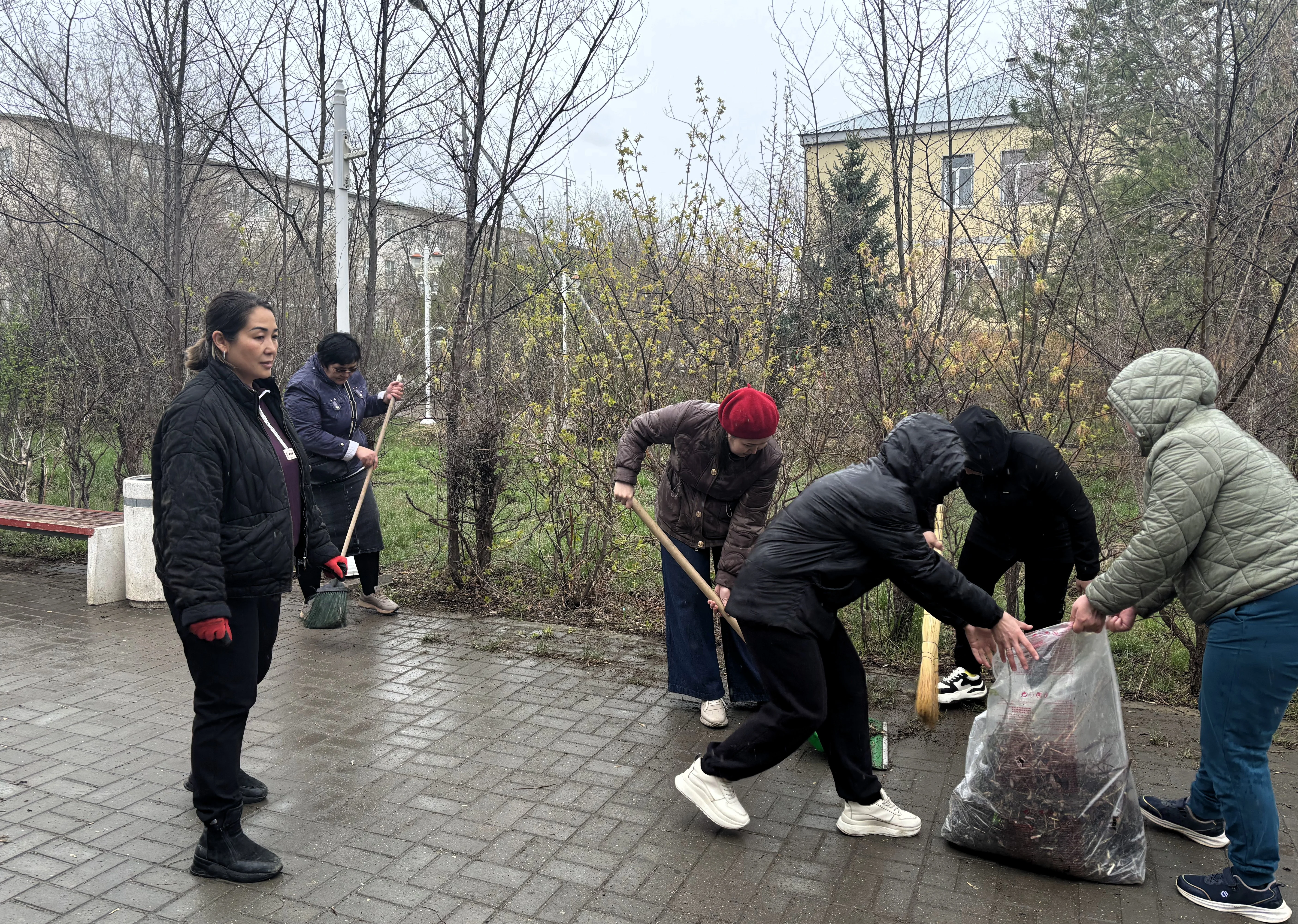 Работы велись практически по всему периметру участка и прилегающим улицам. Участок выше городского акимата и сквер финансистов взяли на себя сотрудники административных подразделений. Они тщательно выметали прошлогоднюю листву, собирали мусор, накопленный за зиму.