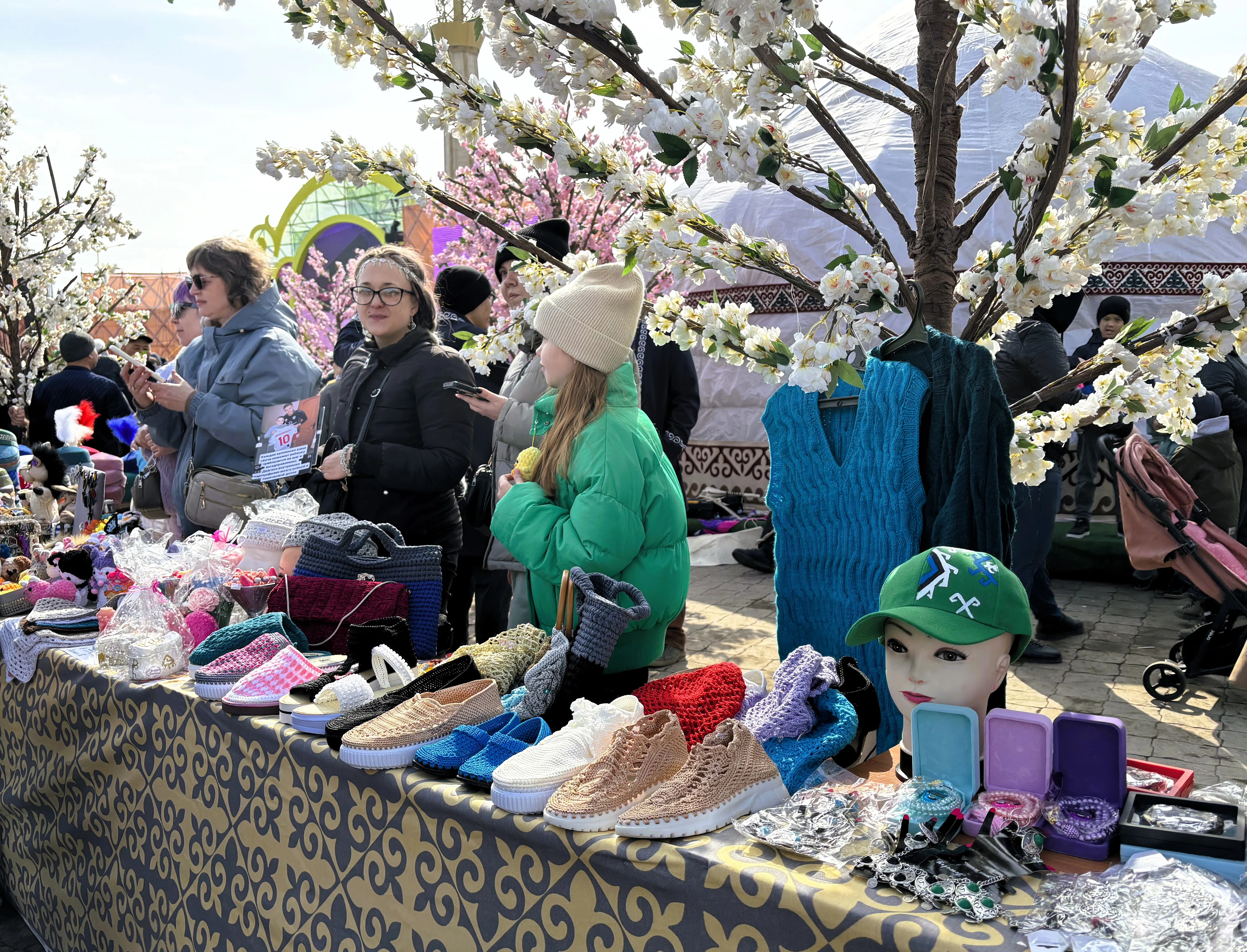 Помимо концертов, для актюбинцев устроили ярмарку ремесленников: мастера привезли национальную одежду, украшения, текстиль, предметы быта. Для кого-то это была возможность купить сувенир, для кого-то увидеть ремесло не на картинке, а вживую.